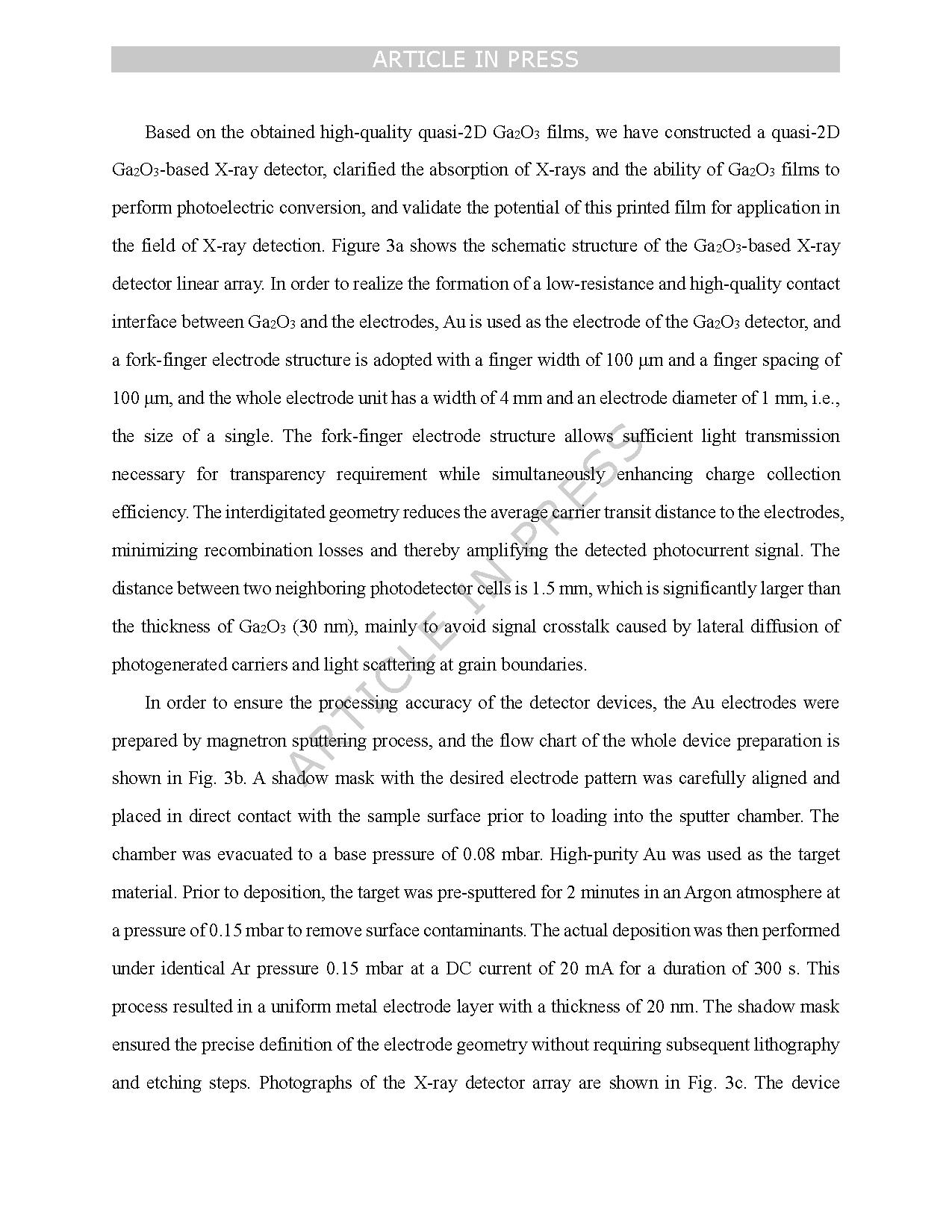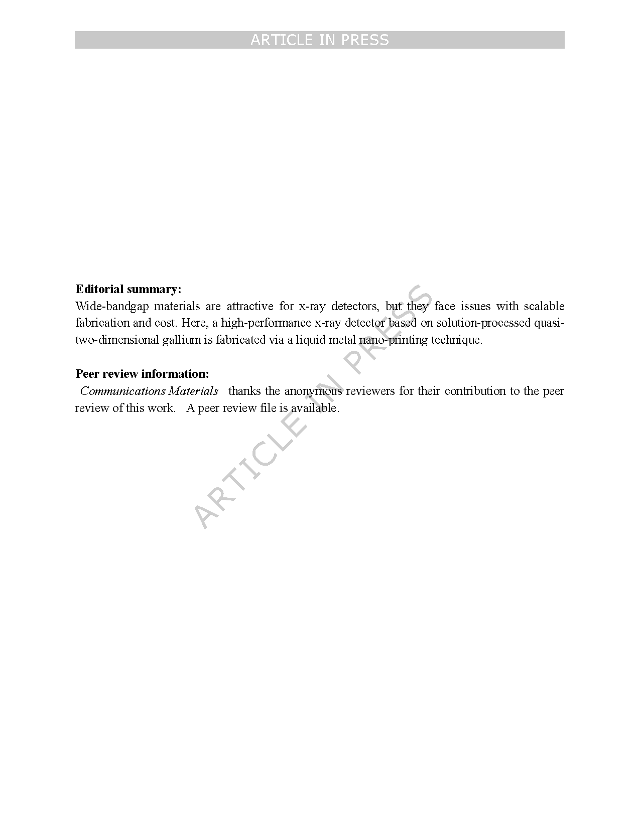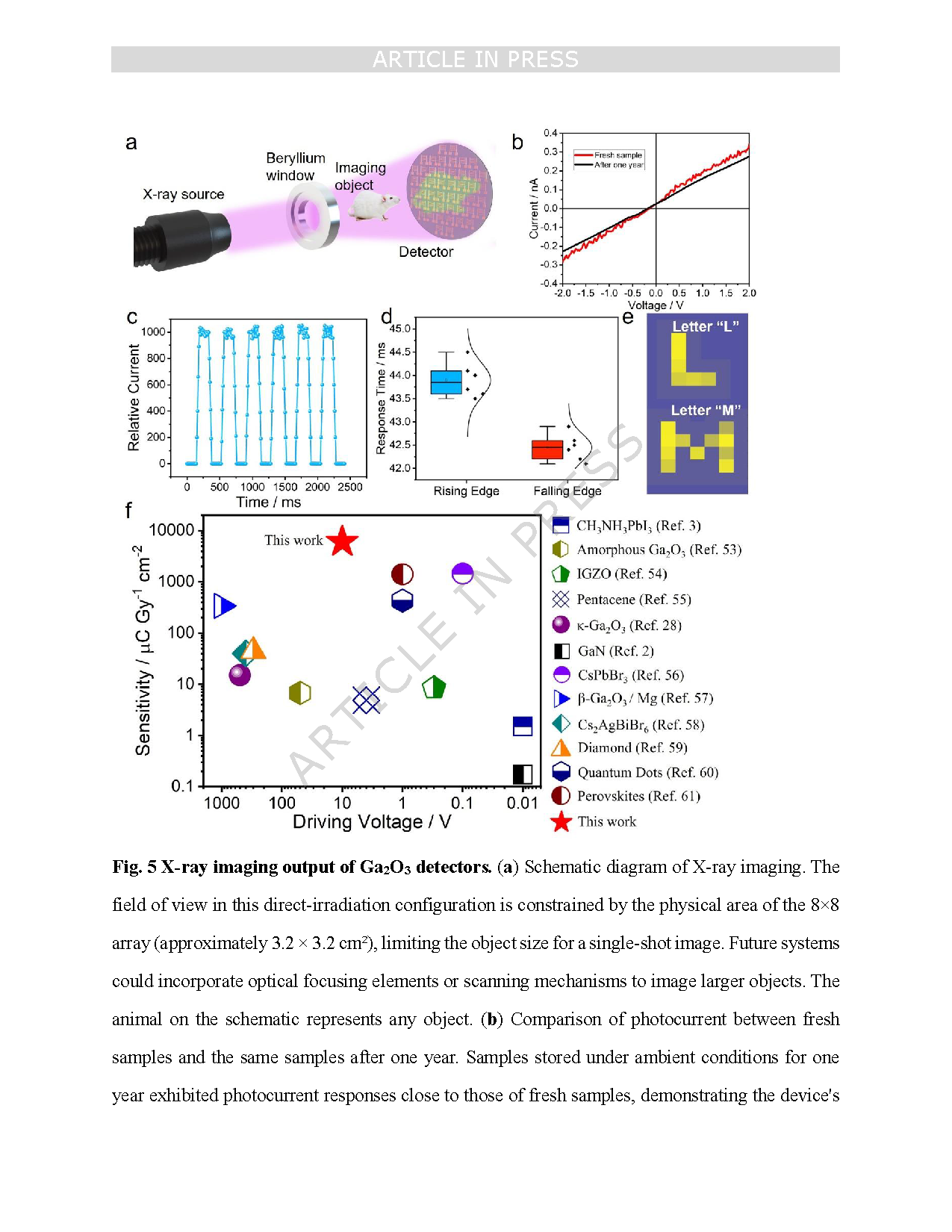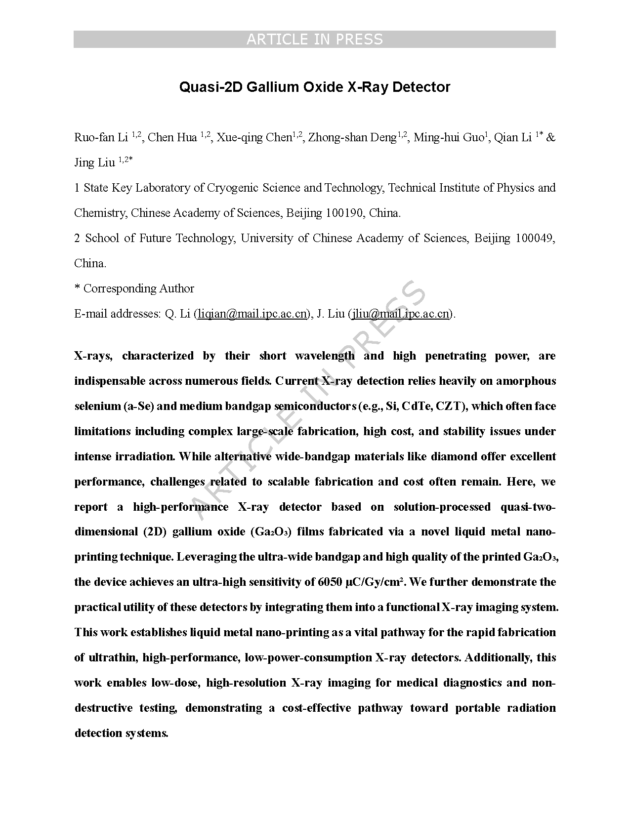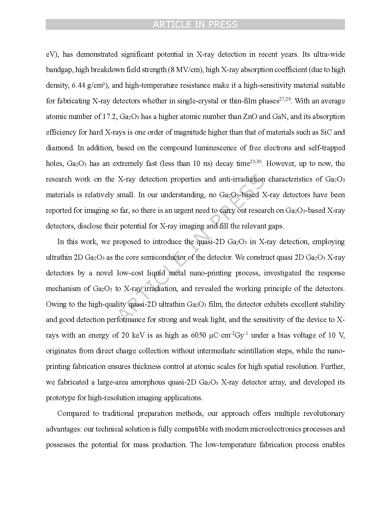 X射线因其波长短、穿透力强的特性,在众多领域不可或缺。当前X射线探测主要依赖非晶硒(a-Se)和中等带隙半导体(如Si、CdTe、CZT),这些材料常面临大规模制造复杂、成本高昂及强辐射下稳定性差等局限。尽管金刚石等宽带隙替代材料性能卓越,但可扩展制造与成本问题仍未解决。本文报道了一种基于溶液加工的准二维氧化镓(Ga2O3)薄膜的高性能X射线探测器,该薄膜通过新型液态金属纳米印刷技术制备。凭借印刷 Ga2O3 材料的超宽带隙特性与卓越品质,该器件实现了 6050 μC/Gy/cm2 的超高灵敏度。通过将其集成至功能性X射线成像系统,进一步验证了该探测器的实用价值。本研究确立了液态金属纳米印刷技术作为快速制备超薄、高性能、低功耗X射线探测器的关键路径。此外,该技术为医疗诊断和无损检测领域实现低剂量高分辨率X射线成像提供了可能,为便携式辐射检测系统开辟了经济高效的发展路径。