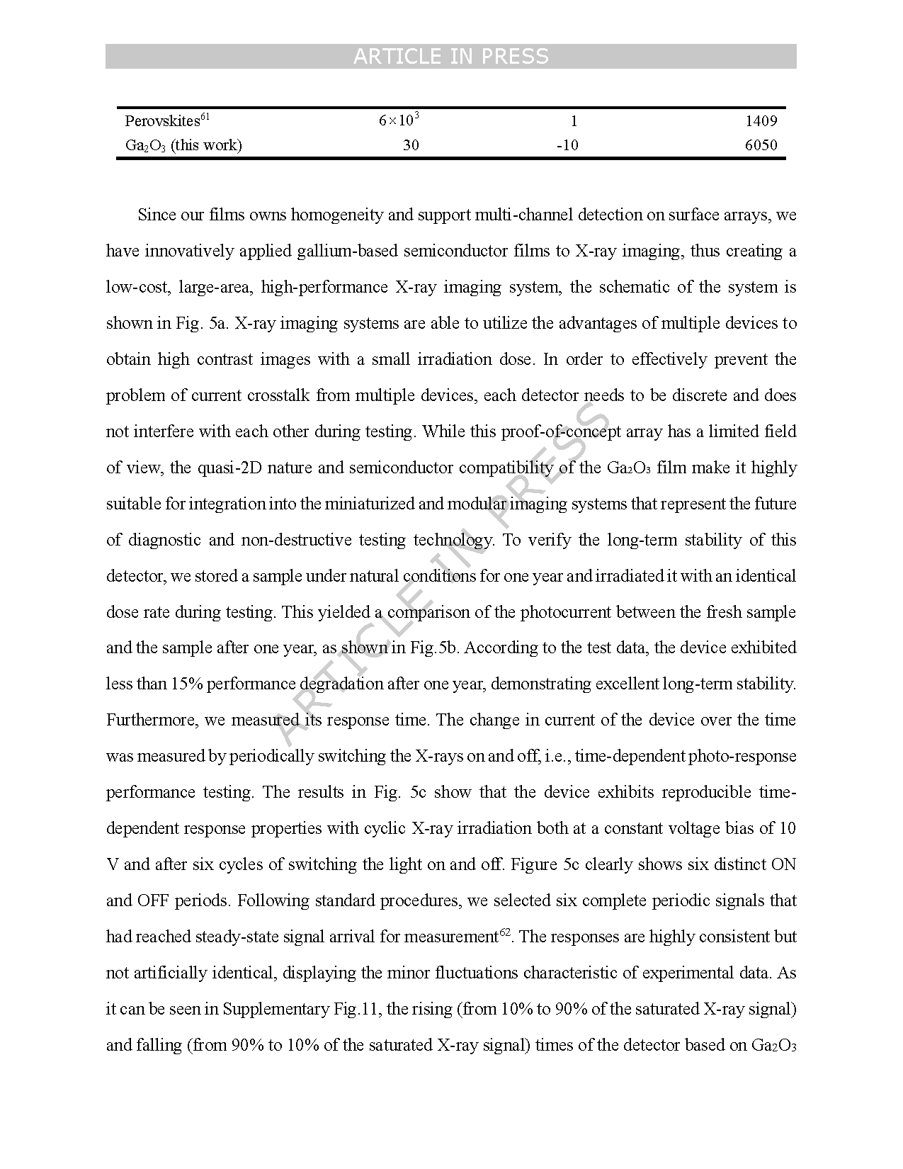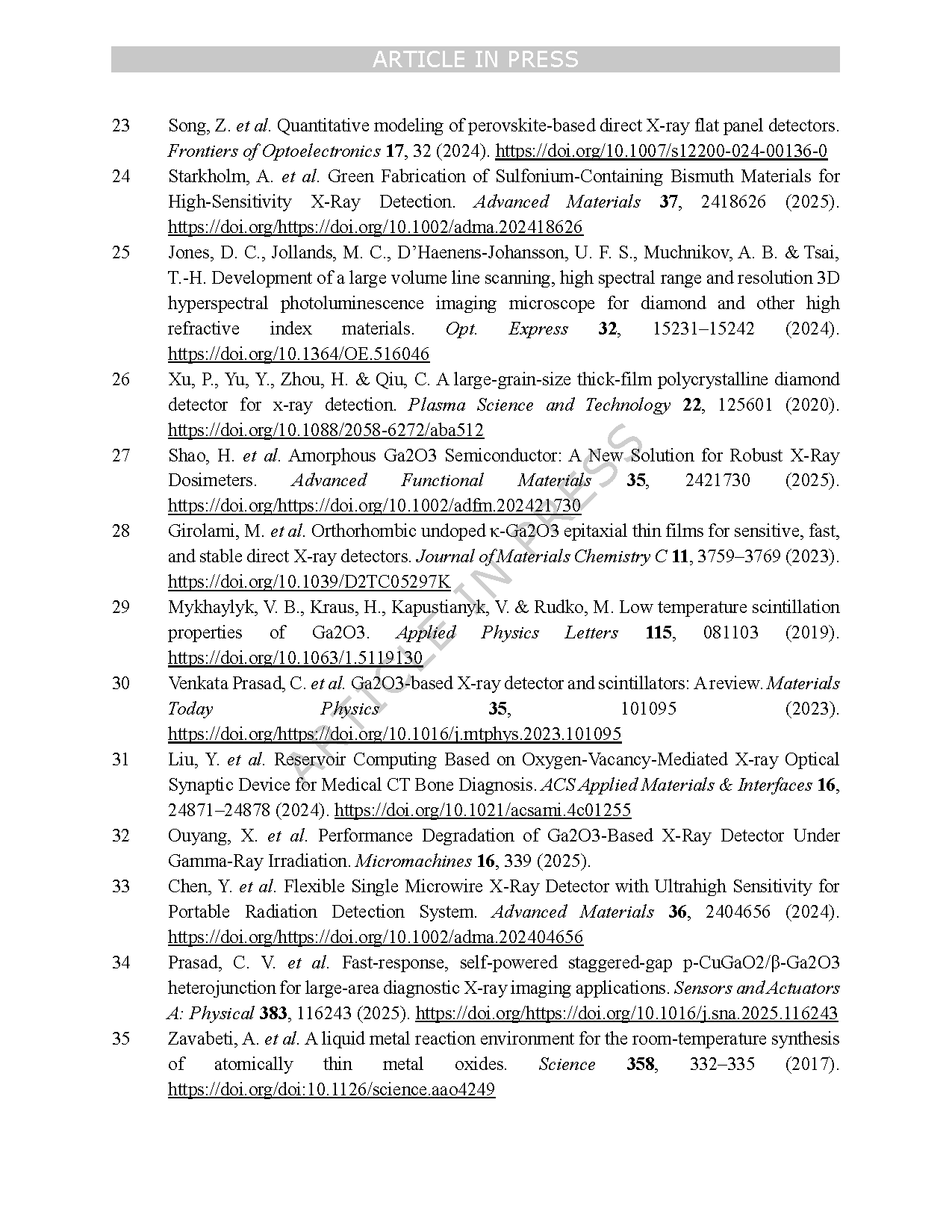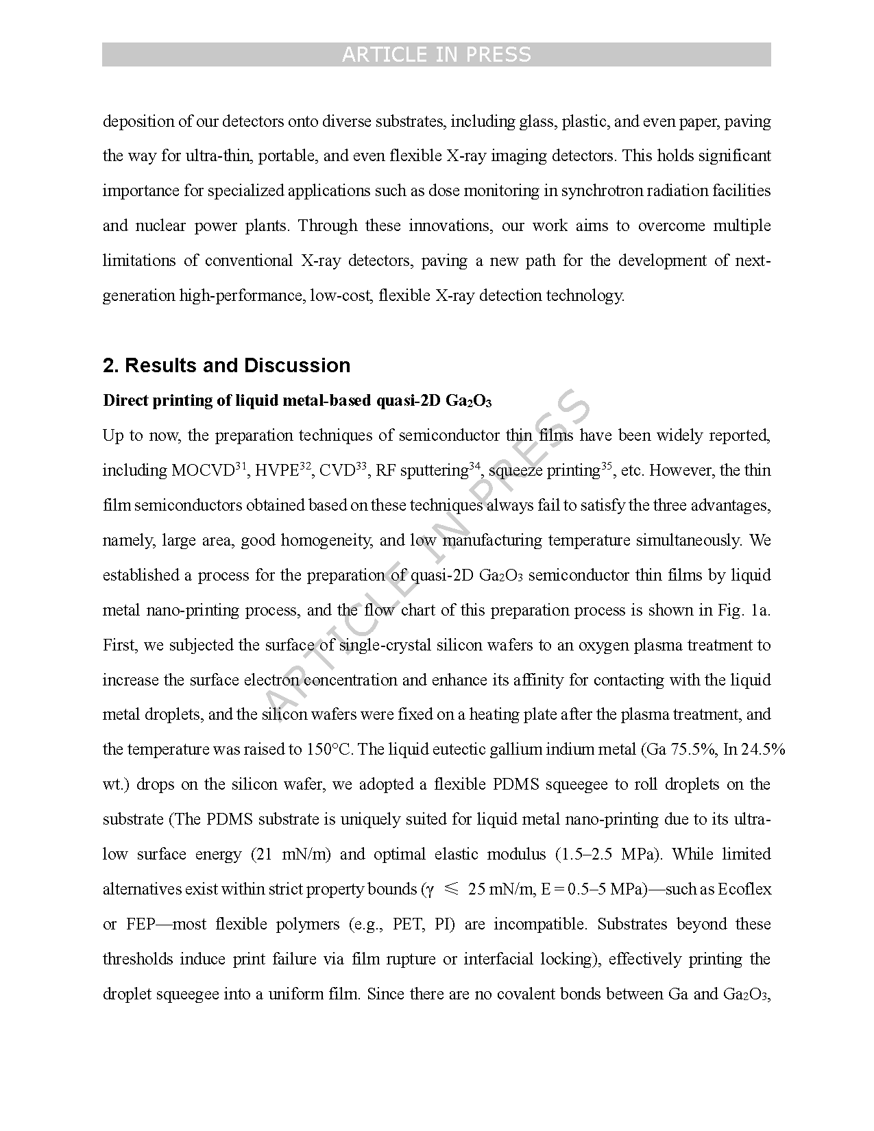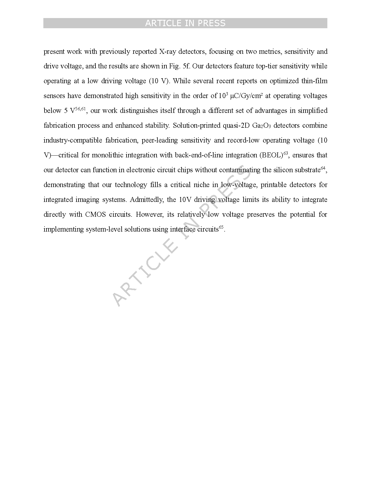 X射线因其波长短、穿透力强的特性,在众多领域不可或缺。当前X射线探测主要依赖非晶硒(a-Se)和中等带隙半导体(如Si、CdTe、CZT),这些材料常面临大规模制造复杂、成本高昂及强辐射下稳定性差等局限。尽管金刚石等宽带隙替代材料性能卓越,但可扩展制造与成本问题仍未解决。本文报道了一种基于溶液加工的准二维氧化镓(Ga2O3)薄膜的高性能X射线探测器,该薄膜通过新型液态金属纳米印刷技术制备。凭借印刷 Ga2O3 材料的超宽带隙特性与卓越品质,该器件实现了 6050 μC/Gy/cm2 的超高灵敏度。通过将其集成至功能性X射线成像系统,进一步验证了该探测器的实用价值。本研究确立了液态金属纳米印刷技术作为快速制备超薄、高性能、低功耗X射线探测器的关键路径。此外,该技术为医疗诊断和无损检测领域实现低剂量高分辨率X射线成像提供了可能,为便携式辐射检测系统开辟了经济高效的发展路径。