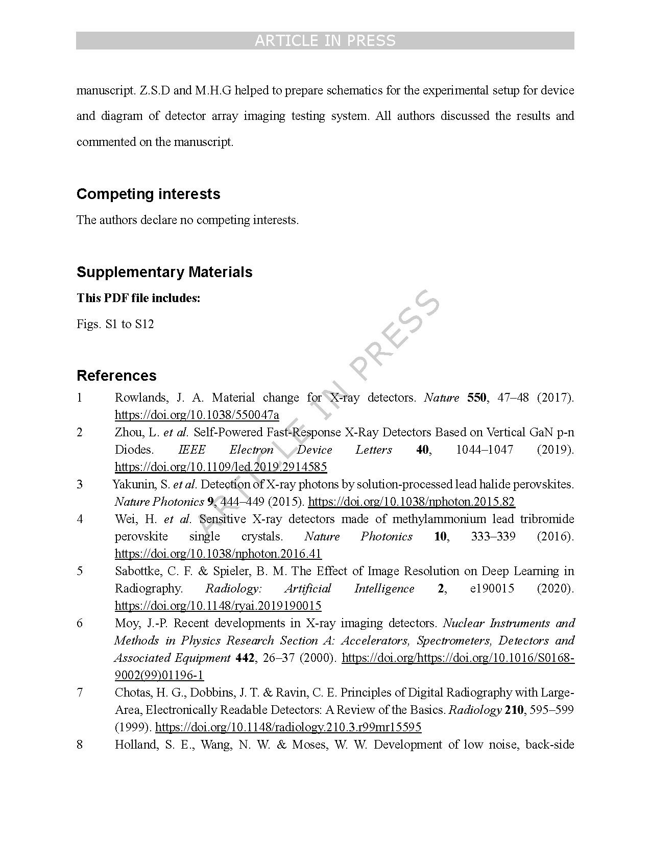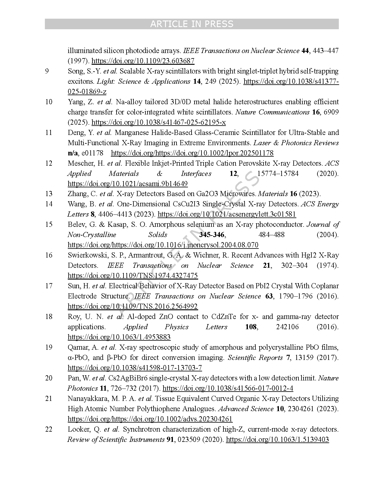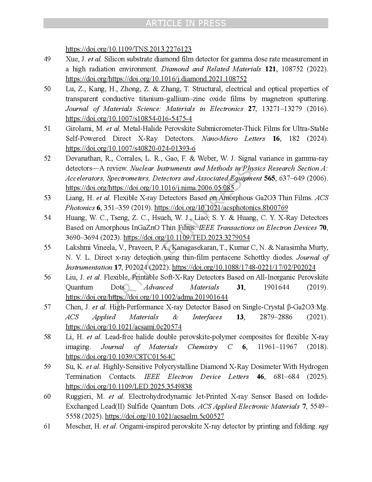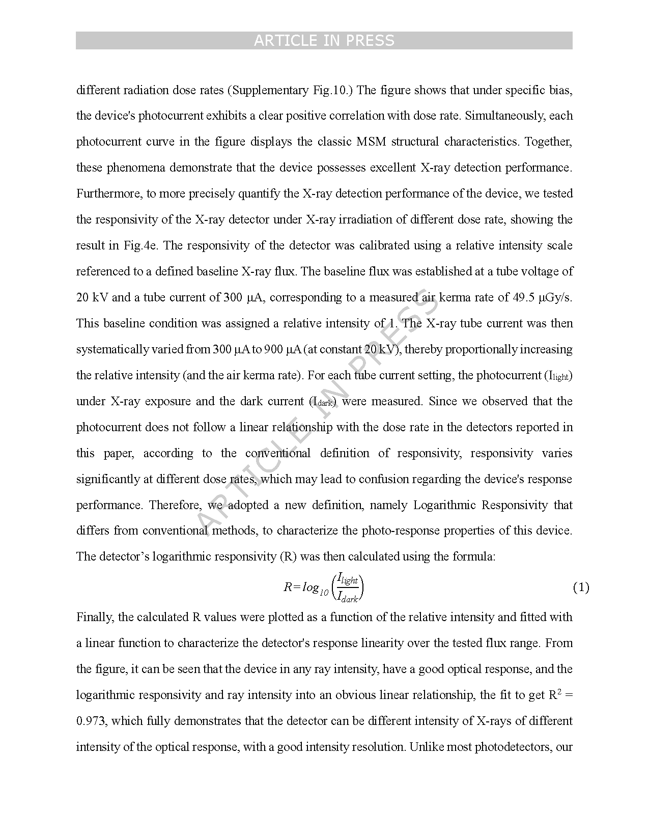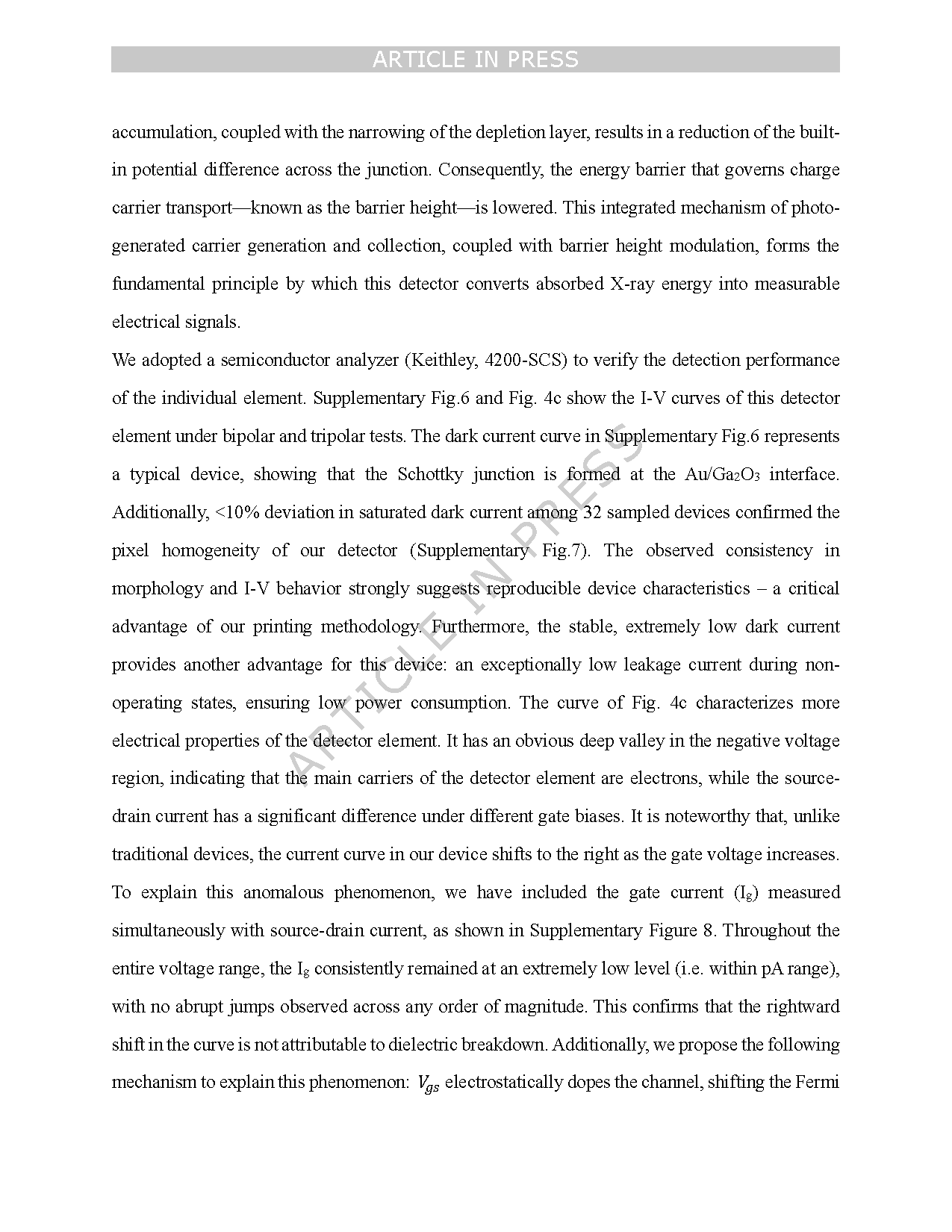 X射线因其波长短、穿透力强的特性,在众多领域不可或缺。当前X射线探测主要依赖非晶硒(a-Se)和中等带隙半导体(如Si、CdTe、CZT),这些材料常面临大规模制造复杂、成本高昂及强辐射下稳定性差等局限。尽管金刚石等宽带隙替代材料性能卓越,但可扩展制造与成本问题仍未解决。本文报道了一种基于溶液加工的准二维氧化镓(Ga2O3)薄膜的高性能X射线探测器,该薄膜通过新型液态金属纳米印刷技术制备。凭借印刷 Ga2O3 材料的超宽带隙特性与卓越品质,该器件实现了 6050 μC/Gy/cm2 的超高灵敏度。通过将其集成至功能性X射线成像系统,进一步验证了该探测器的实用价值。本研究确立了液态金属纳米印刷技术作为快速制备超薄、高性能、低功耗X射线探测器的关键路径。此外,该技术为医疗诊断和无损检测领域实现低剂量高分辨率X射线成像提供了可能,为便携式辐射检测系统开辟了经济高效的发展路径。