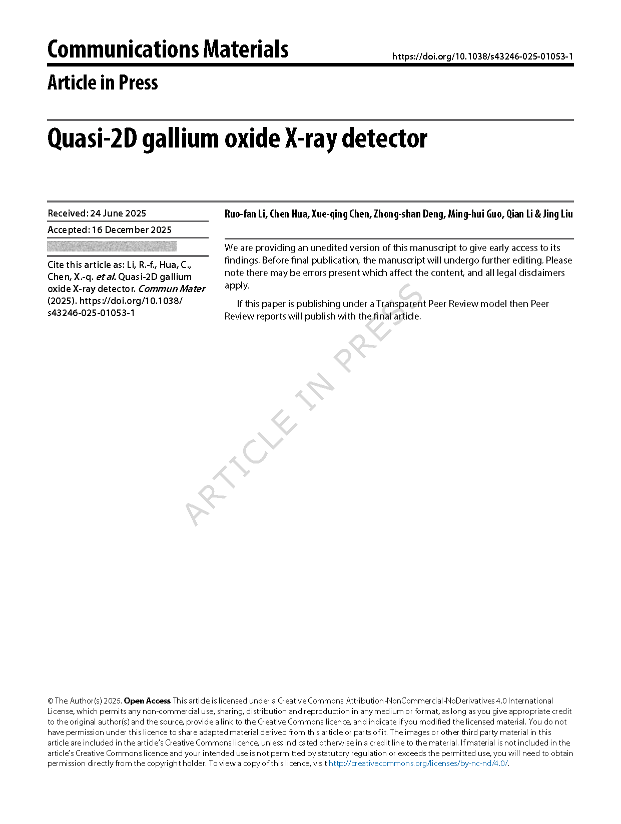 由中国科学院低温工程学重点实验室的研究团队在学术期刊 Communications Materials 发布了一篇名为 Quasi-2D gallium oxide X-ray detector(准二维氧化镓X射线探测器)的文章。