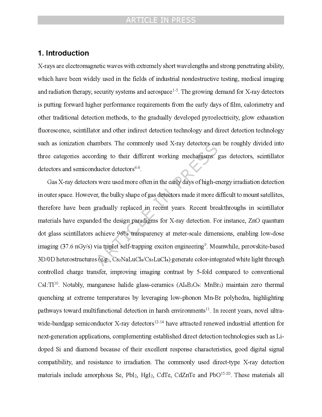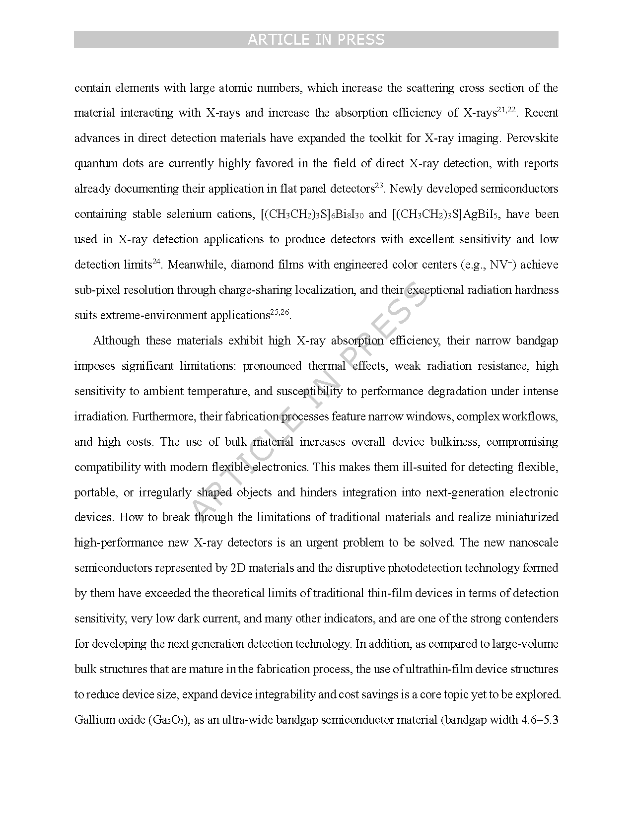 X 射线作为波长极短、穿透力极强的电磁波,在与物质相互作用时会发生光电效应、康普顿散射等现象。其应用涵盖了医疗诊断、工业无损检测、安检系统、放射治疗以及航空航天探索等关键领域。探测技术的演变历程从最初的胶片显影、量热法,演变到后来的闪烁体和电离室。其中有三类主要探测器,气体探测器早期用于空间高能辐射检测,但由于体积庞大,难以满足微小型化和卫星搭载的需求。闪烁体探测器通过将 X 射线转化为可见光进行间接探测。虽然近期在 ZnO 量子点玻璃和钙钛矿异质结等材料上取得了突破(实现了低剂量成像和高对比度),但其复杂的转换过程限制了效率。半导体探测器属于直接探测技术,具有响应快、信号兼容性好等优点。当前X射线探测主要依赖非晶硒(a-Se)和中等带隙半导体(如Si、CdTe、CZT)。在高强度辐射下,容易产生严重的热效应,抗辐射性能弱,且对环境温度高度敏感,导致性能随时间退化。虽然金刚石等超宽禁带材料性能优异,但其大规模制造工艺复杂、成本昂贵。此外,块体材料的体积限制了其在柔性、便携式及现代电子设备中的集成。作为超宽禁带材料, Ga2O3 具有极高的击穿电场和天然的抗辐射特性,且能通过溶液法等低成本工艺生长。准二维结构能突破传统薄膜器件的理论极限,不仅能显著降低暗电流,还能实现器件的轻薄化和高柔性,是下一代高性能探测器的核心方向。