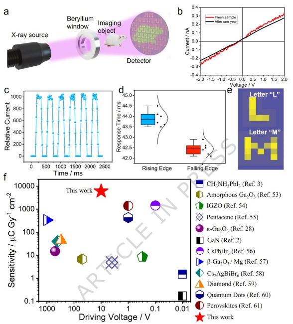 图5.Ga2O3 探测器的 X 射线成像输出。(a)X 射线成像示意图。此直接照射配置的视野受限于 8 × 8 阵列的物理面积(约 3.2 × 3.2 cm2),从而限制了单次曝光成像的物体尺寸。未来系统可集成光学聚焦元件或扫描机构以成像更大物体。示意图中的动物代表任意物体。(b)新样品与存放一年后相同样品的光电流对比。常温存放一年后的样品光电流响应接近新样品,证明器件具有优异的长期稳定性。(c) 探测器响应时间测试:测量六个周期后,上升沿平均响应时间为 43.8 ms,下降沿响应时间为 42.5 ms。照明相对电流值约为 1000,表明其具备周期稳定特性。(d) 探测器上升沿与下降沿响应时间的箱线图,箱体表示 Q1 至 Q3 数据区间,误差条反映各数据集的极端偏差,正态曲线展示响应时间分布。(e) 探测器成像验证效果图,采用 1 mm 厚铜屏蔽 X 射线并测量其相对电流,高相对电流标记为蓝色,低相对电流标记为黄色。图中清晰呈现“L”与“M”字母的成像效果,且边角结构细节分明。(f) 探测器性能对比图,本研究成果以红色五角星标记于图中。