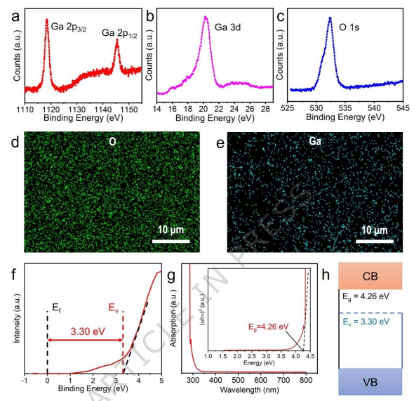 图2. 二维 Ga2O3 材料表征。(a)-(c) Ga2O3 薄膜的 XPS 分析:(a) 对应 1110-1155 eV 能量区间; (b) 对应 14-29 eV 能量区间,(c) 对应 525-545 eV 能量区间。(d)、(e) Ga2O3 薄膜的 EDS 光谱图,以荧光图像形式呈现薄膜成分并显示其空间分布。(f) Ga2O3 薄膜的 VB-XPS 测试图,揭示其价带位置。(g) UV-Vis-NIR 分光光度计图像,显示 Ga2O3 的带隙。(h) Ga2O3 薄膜能带结构示意图。