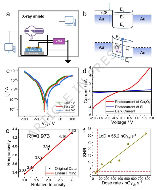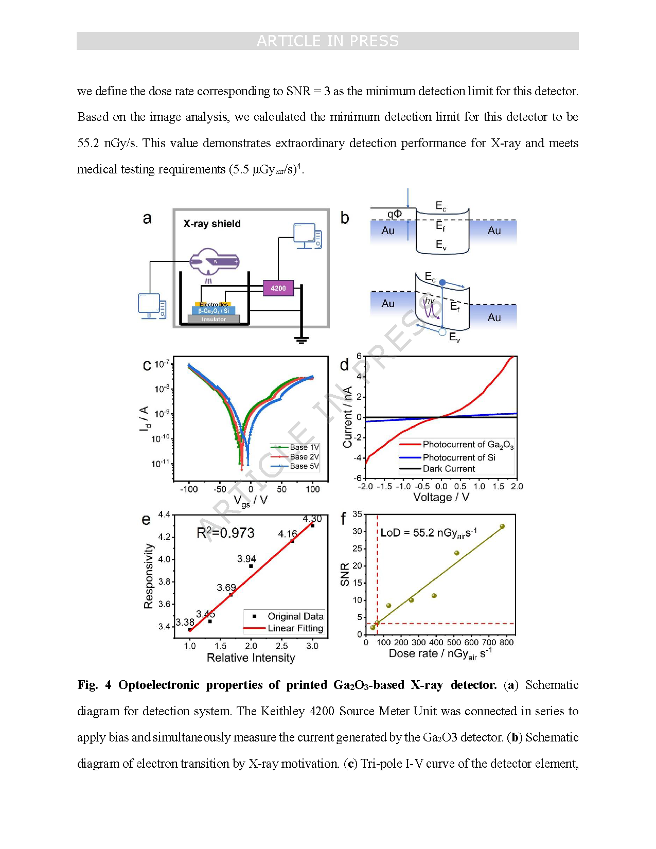 图4. 印刷式 Ga2O3 基 X 射线探测器的光电特性。(a) 检测系统示意图。Keithley 4200 源表单元串联连接,用于施加偏压并同步测量 Ga2O3 探测器产生的电流。(b) X 射线激发电子跃迁示意图。(c) 探测器元件的三极管 I-V 曲线,采用晶圆背面作为栅极,正面一对电极分别作为源极和漏极。图中曲线分别对应 1 V、2 V 和 5 V 偏压下的测试结果。(d) 探测器元件的光电流与暗电流对比图,可见在 20 kV X 射线(辐射剂量 99 μGyairs-1)条件下,光电流与暗电流存在数量级的差异。此外,可见 Ga2O3 薄膜的光电流在低驱动电压下与硅片相比存在数量级的差异,有力证明了器件的光导响应主要由氧化镓贡献。(e) 检测元件灵敏度曲线:在不同辐射强度下测量光暗电流比值并取对数,进行线性拟合后获得良好的线性曲线。点外侧的数字表示电流比值的对数值。(f) 不同剂量率下的器件信噪比。根据图像测定,该器件的最小检测限 (LoD) 为 55.2 nGy/s。