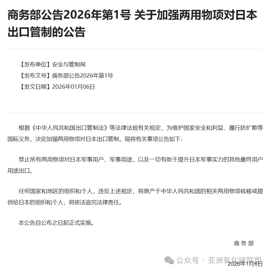获悉,1月6日,商务部公告,根据《中华人民共和国出口管制法》等法律法规有关规定,为维护国家安全和利益、履行防扩散等国际义务,决定加强两用物项对日本出口管制。