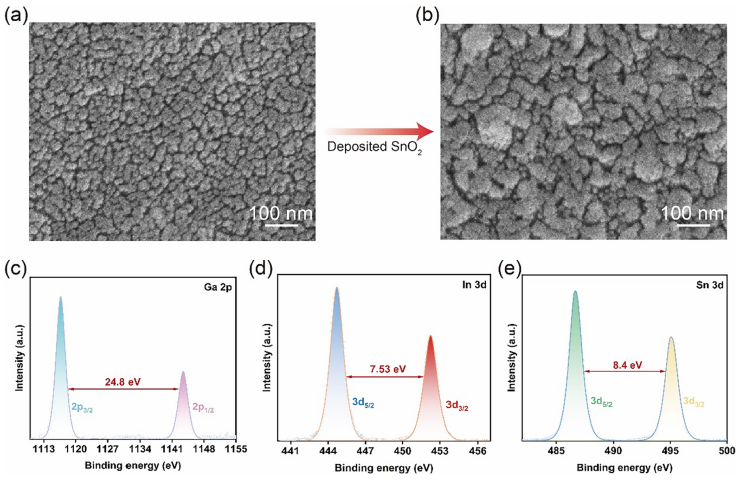 图3. (a) p-GaN/In:Ga2O3 薄膜与 (b) p-GaN/In:Ga2O3/SnO2 薄膜的俯视扫描电子显微镜图像。In:Ga2O3 薄膜的 (c) Ga 2p 与 (d) In 3d XPS 能谱。SnO2 的 (e) Sn 3d XPS 能谱。