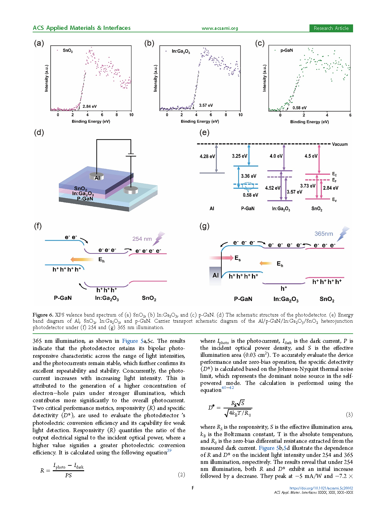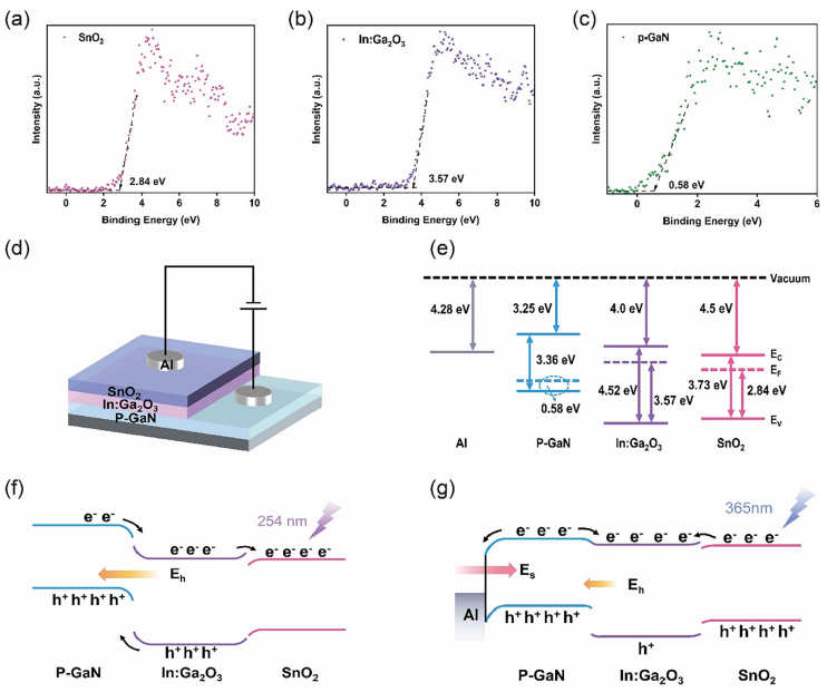 图6. (a) SnO2、(b) In:Ga2O3 和 (c) p-GaN 的 XPS 价带谱。(d) 光探测器的示意结构。(e) Al、SnO2、In:Ga2O3 及 p-GaN 的能带图。Al/p-GaN/In:Ga2O3/SnO2 异质结光探测器在 (f) 254 nm 和 (g) 365 nm 光照下的载流子传输示意图。