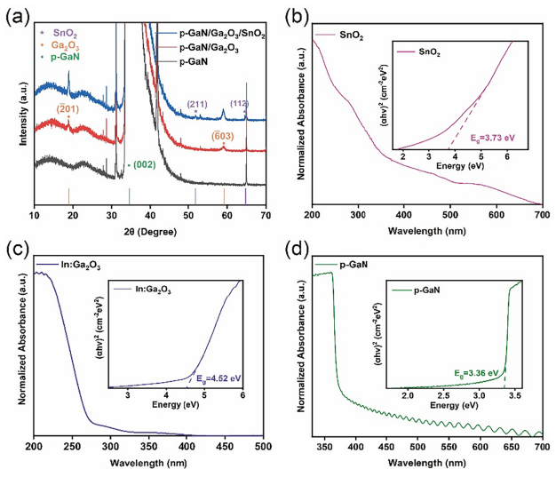 图2. (a) p-GaN、p-GaN/In:Ga2O3 及 p-GaN/In:Ga2O3/SnO2 薄膜的 XRD 衍射图谱。(b) SnO2、(c) In:Ga2O3 及 (d) p-GaN 薄膜的归一化吸收光谱。插图显示 (αhυ)2 与 hυ 之间的关系。
