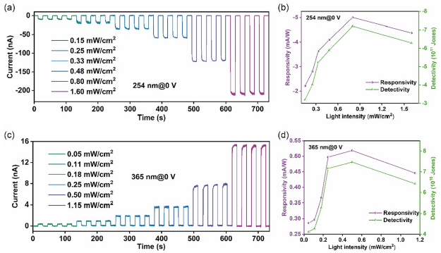 图5. (a) Al/p-GaN/In:Ga2O3/SnO2 光探测器在 254 nm 照射下不同光强和零偏压条件下的瞬态光响应曲线。(b) 光探测器在 254 nm 照射下不同光强和零偏压条件下的响应度 (R) 与检出率 (D*) 曲线。(c) 光探测器在 365 nm 照射下不同光强和零偏压条件下的瞬态光响应曲线。(d) 光探测器在 365 nm 照射下不同光强和零偏压条件下的响应度 (R) 与检出率 (D*) 曲线。