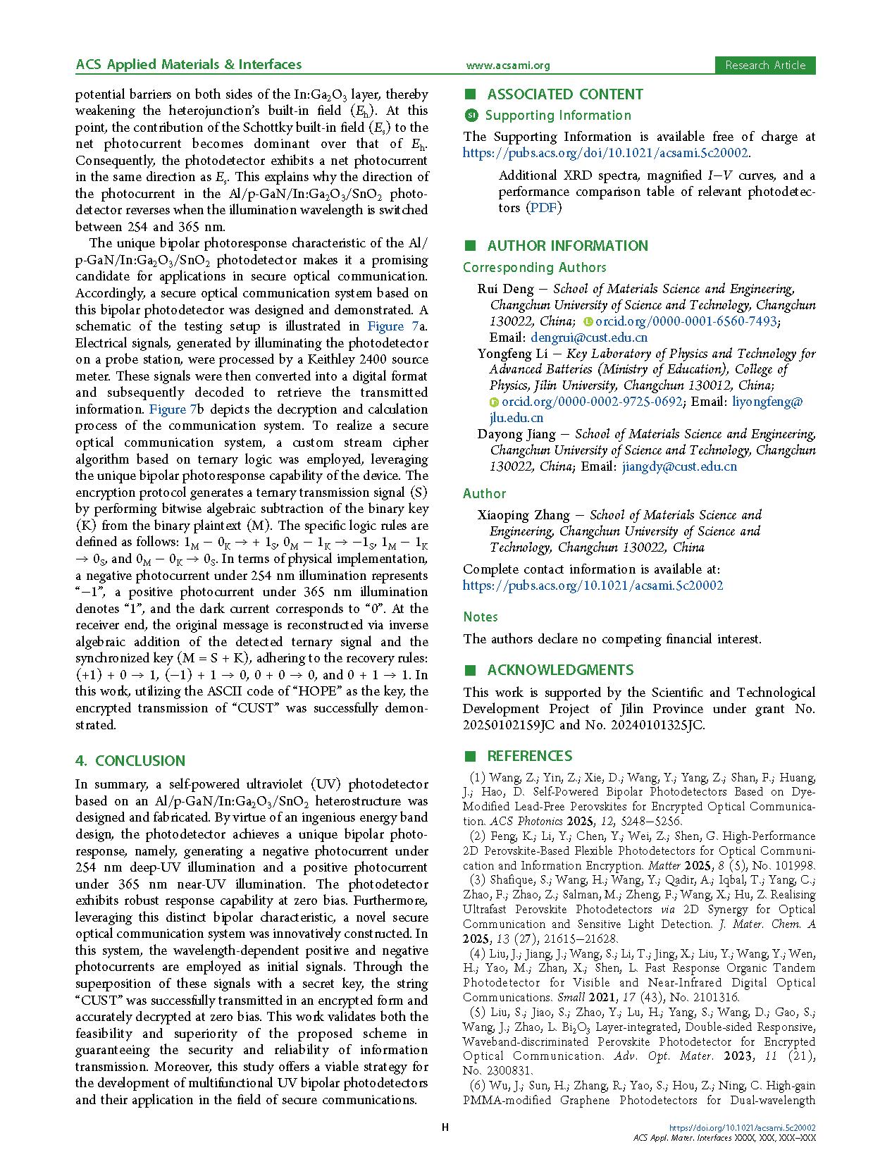 由长春理工大学的研究团队在学术期刊 ACS Applied Materials & Interfaces 发布了一篇名为 Self-Powered Wavelength-Selective Ultraviolet Bipolar Photodetector Based on Al/p-GaN/In:Ga2O3/SnO2 Structure for Secure Optical Communication(基于Al/p-GaN/In:Ga2O3/SnO2结构的自供电波长选择性紫外双极光探测器在安全光通信中的应用)的文章。