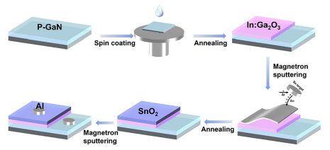图1. Al/p-GaN/In:Ga2O3/SnO2 光探测器的制备流程示意图。