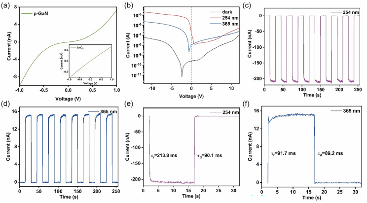 图4. (a) p-GaN 在暗环境下的 I-V 曲线。插图显示 SnO2 在暗环境下的 I-V 曲线。(b) Al/p-GaN/ In:Ga2O3/SnO2 光探测器在暗态、254 nm(1.6 mW/cm2)及 365 nm(1.15 mW/cm2)照射下的半对数 I-V 曲线。光探测器在零偏压下 (c) 254 nm 和 (d) 365 nm 照射下的瞬态光响应曲线。光探测器在零偏压下 (e) 254 nm 和 (f) 365 nm 照射下单响应周期的瞬态光响应曲线。
