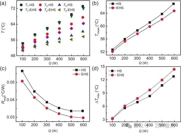 图 5 全面概述了微纳结构散热器的热性能。与基准铜散热器(HS)相比,工程化表面涂层(EHS)增强了沸腾传热特性,显著降低了 TTV 的壳温。强化散热器(EHS)成功地在所有测量点保持了较低的温度(图 5(a))。图 5(b)-(c)的定量分析显示,EHS 将平均壳温从 66.9℃(HS)降至 64.7℃,同时将平均热阻降低 12%。虽然 EHS 提高了整体冷却效率,但其局部强化效应在 600W 时将最大温差从 12.7℃(HS)增大到 14.3℃(图 5(d)),这表明在温度均匀性和峰值温度抑制之间存在权衡。