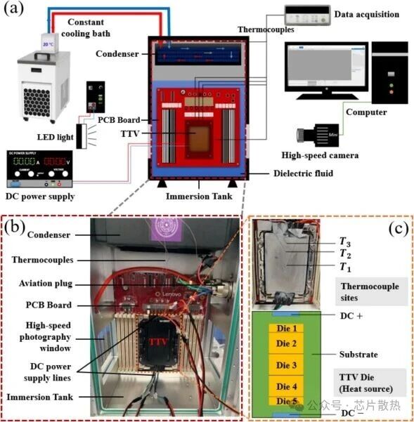 图 1 两相浸没冷却实验装置:(a)实验装置示意图;(b)浸没罐内部照片;(c)TTV 封装盖子的热电偶安装位置及 TTV 内部芯片分布。