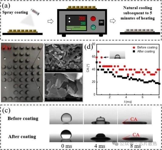 图 3 沸腾强化微纳结构的制备与表征:(a)用于制备沸腾强化表面的喷涂工艺;(b)涂层后的散热器及用于微纳结构分析的 SEM 扫描图像;(c)Noah-2100A 液滴在散热器表面的润湿性;(d)与(c)中图像对应的接触角(CA)时间演变。