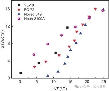 尽管通过更复杂的带盖封装工艺已实现 0.025℃/W 的最小热阻,但本文提出的 EHS-VC 结构在性能和可制造性之间取得了有竞争力的平衡。此外,将本研究中 EHS-VC 的实验结果与参考文献 [30] 图 14 中报道的沸腾曲线数据进行了比较,如图 10 所示。总之,尽管早期研究主要侧重于增加散热器结构上的成核点或扩大表面积,但我们的 EHS 采用了多尺度方法,并将 EHS 与均热板集成,进一步克服了早期浸没冷却研究中很少涉及的热扩展阻问题。