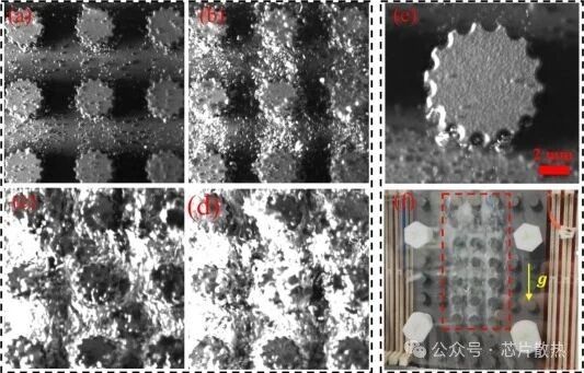 图 6 混合结构表面气泡生长和脱离的可视化分析:(a)𝑄=100W;(b)𝑄=200W;(c)𝑄=400W;(d)𝑄=600W;(e)𝑄=50W 时单个圆柱上气泡产生的放大图(比例尺:2 毫米);(f)600W 功率下 EHS 的全景照片(g:重力加速度)。