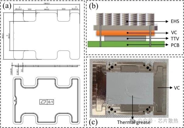 图 8 通过集成均热板解决显著温差和散热问题:(a)根据 EHS 基底尺寸设计的均热板图纸;(b)均热板与 EHS 集成的示意图;(c)均热板与 EHS 集成的底部视图。