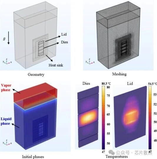 图 7 数值模拟得到的芯片和盖子温度分布:展示了通过数值模拟获得的芯片和盖子的温度分布情况。