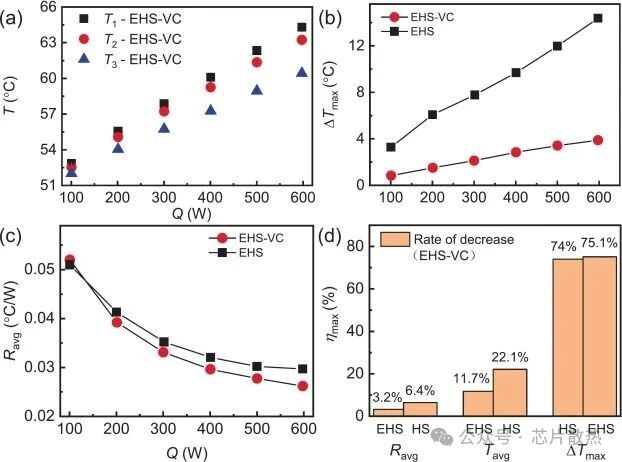 图 9 均热板集成后的散热性能对比:(a)集成均热板后各热电偶对应的温度分布;(b)EHS-VC 与 EHS 的最大温差对比;(c)EHS-VC 与 EHS 的平均热阻对比;(d)散热性能强化比例对比。
