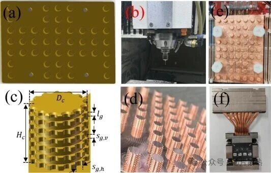 图 2 两相浸没散热器的设计与制造:(a)散热器设计图;(b)用于机械加工的 CNC 机床;(c)圆柱形针翅和齿的结构尺寸图;(d)散热器的实物照片及局部放大图;(e)基准铜散热器(HS)垂直安装在 PCB 板上;(f)从服务器上拆下的原散热器。