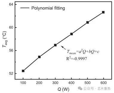根据摩尔定律下器件尺寸持续缩小的趋势,高性能 CPU 和 GPU 的功率耗散预计将超过 1000W。为评估我们的系统在这种条件下的冷却能力,对实验热数据进行了二阶多项式回归。如图 11 所示,假设边界条件相同,所提出的模型预测在千瓦级功率下,平均壳温为 68.2℃。此外,本方法仍面临某些限制,包括依赖增加成本的高导热系数材料,以及需要精确制造控制的多尺度制造工艺。