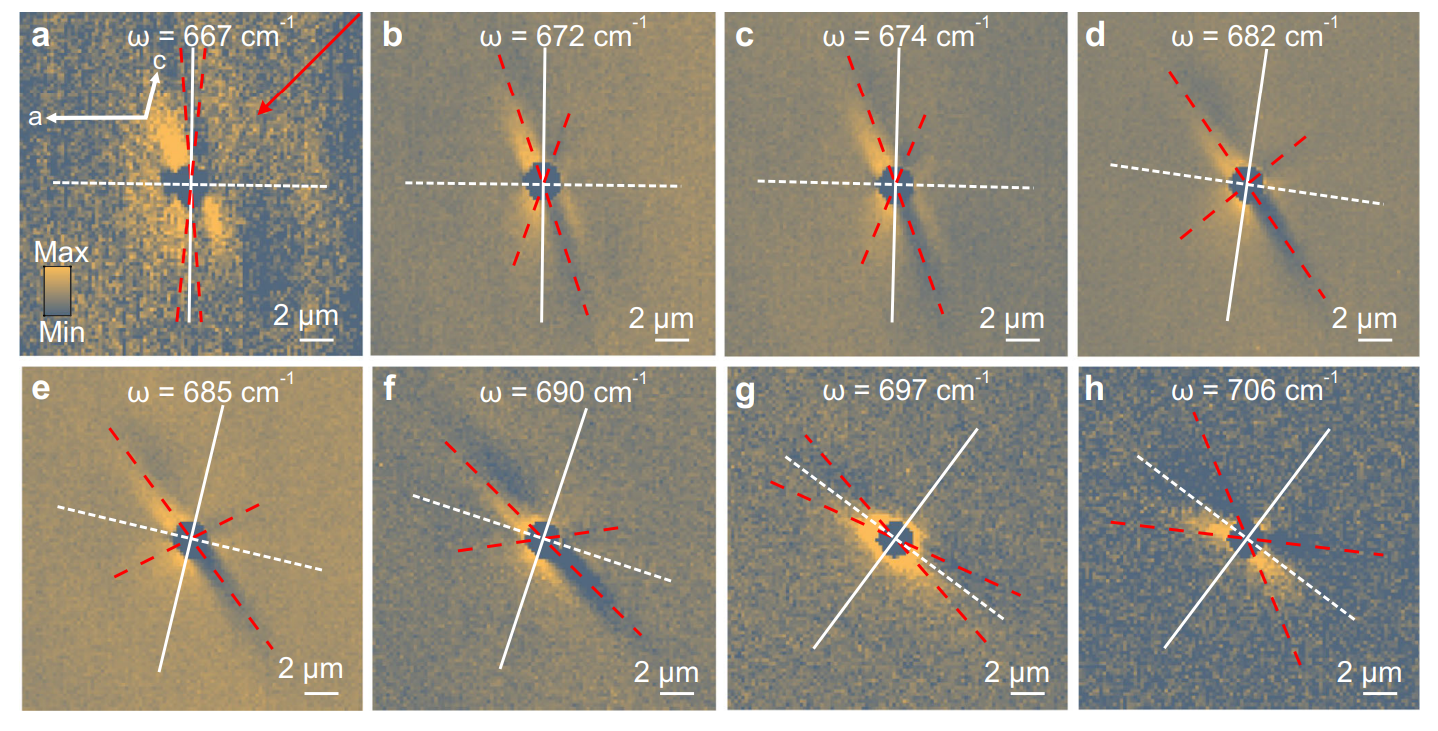 图2 | 低对称性双曲极化子在同位素替代 18O bGO 薄膜上的近场传播(a–h) 1.2 µm 厚同位素替代 bGO 薄膜(同晶外延生长在 16O bGO 衬底上)的 HShPs 近场显微图像。模式由直径 2 µm 的 Au 圆盘激发。各面板显示在不同入射频率下记录的图像。所有图像均显示在探针振动频率二次谐波下解调的光学振幅 (O2A),信号采集采用自同相干检测方案。红色虚线表示极化子波前渐近线。白色线表示材料体系的两个主要极化轴。