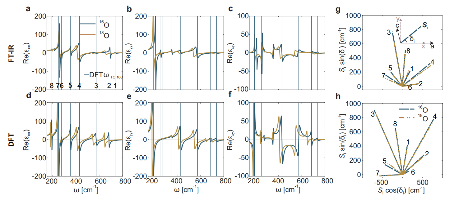 图3 | 16O 和 18O bGO 的实验与理论介电函数数据(a–f) 16O 和 18O bGO 的 ɛxx、ɛyy 和 ɛxy 实部,分别用蓝色和橙色曲线表示。数据来自方位依赖偏振反射测量 (a–c) 与第一性原理计算 (d–f)。实线垂直线标示理论推导的 16O bGO TO 声子频率位置。(g, h) 单斜 a–c 平面 Bu 模的振荡器方向矢量 si,分别由实验(FT-IR,g)和理论(DFT,h)得到。
