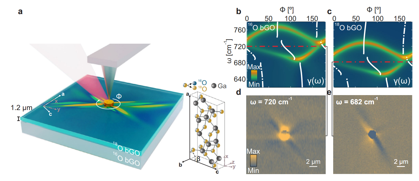 图1 | 同位素替代引起的 β-Ga2O3 双曲剪切极化子频谱偏移(a) 自由电子激光(FEL)耦合 s-SNOM 系统的 3D 示意图,展示了在 1.2 µm 厚的 18O bGO 外延薄膜(同晶外延生长在 16O bGO 衬底上)表面,通过 Au 圆盘激发 HShPs 的过程。插图显示 bGO 常规晶胞的球棍示意图。晶格常数为 a = 12.23 Å,b = 3.04 Å,c = 5.80 Å,a 和 c 晶轴间的单斜角 β = 103.76° 。单斜 a–c 平面与样品表面重合。(b, c) 通过转移矩阵模拟在固定面内动量kip∕k0 = 1.1下得到的 16O (b) 和 18O (c) bGO 同位素的方位色散。白色曲线表示光轴色散,即光轴方向 γ(ω) 的频率依赖性,利用公式 1计算,并采用从第一性原理理论获得的参数。红色虚点线标出面板 (d, e) 中 s-SNOM 图像采集的入射频率。(d, e) 16O (d) 和 18O (e) bGO 同位素 HShPs 的实验近场图像,入射频率分别为 720 cm-1 和 682 cm-1。