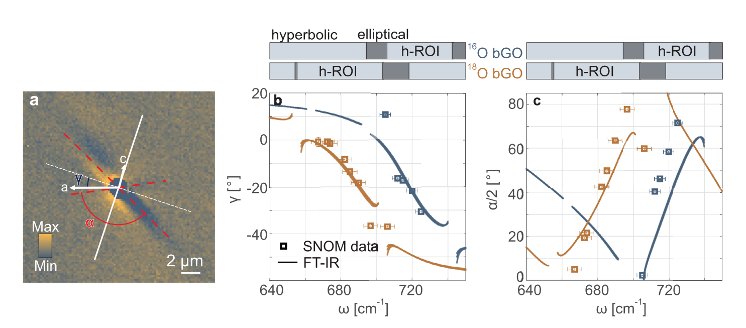 图4 | 通过同位素替代实验验证光轴色散 γ 与双曲线开口角 α 的频谱调控(a) γ 和 α 的示意图。光轴色散角 γ 定义为晶体学 a 轴与主要极化轴(白色虚线)之间的夹角;开口角 α 定义为两条极化子射线(红色虚线)之间的夹角。示例选取了入射频率为 690 cm-1 的 s-SNOM 图像。(b, c) 16O(蓝色曲线)和 18O(橙色曲线)bGO 的光轴色散角 γ (b) 和开口角 α (c)。橙色方块表示从图2 s-SNOM 图像中提取的异质外延结构近场结果及误差条。蓝色方块表示 16O bGO 图像提取的数据。实线曲线根据实验介电函数数据解析得到,并标注了实验测量不确定性产生的误差范围。灰色阴影条表示不同类型声子极化子支持的频谱范围,h-ROI 表示 HShPs 定义的超曲率频段。