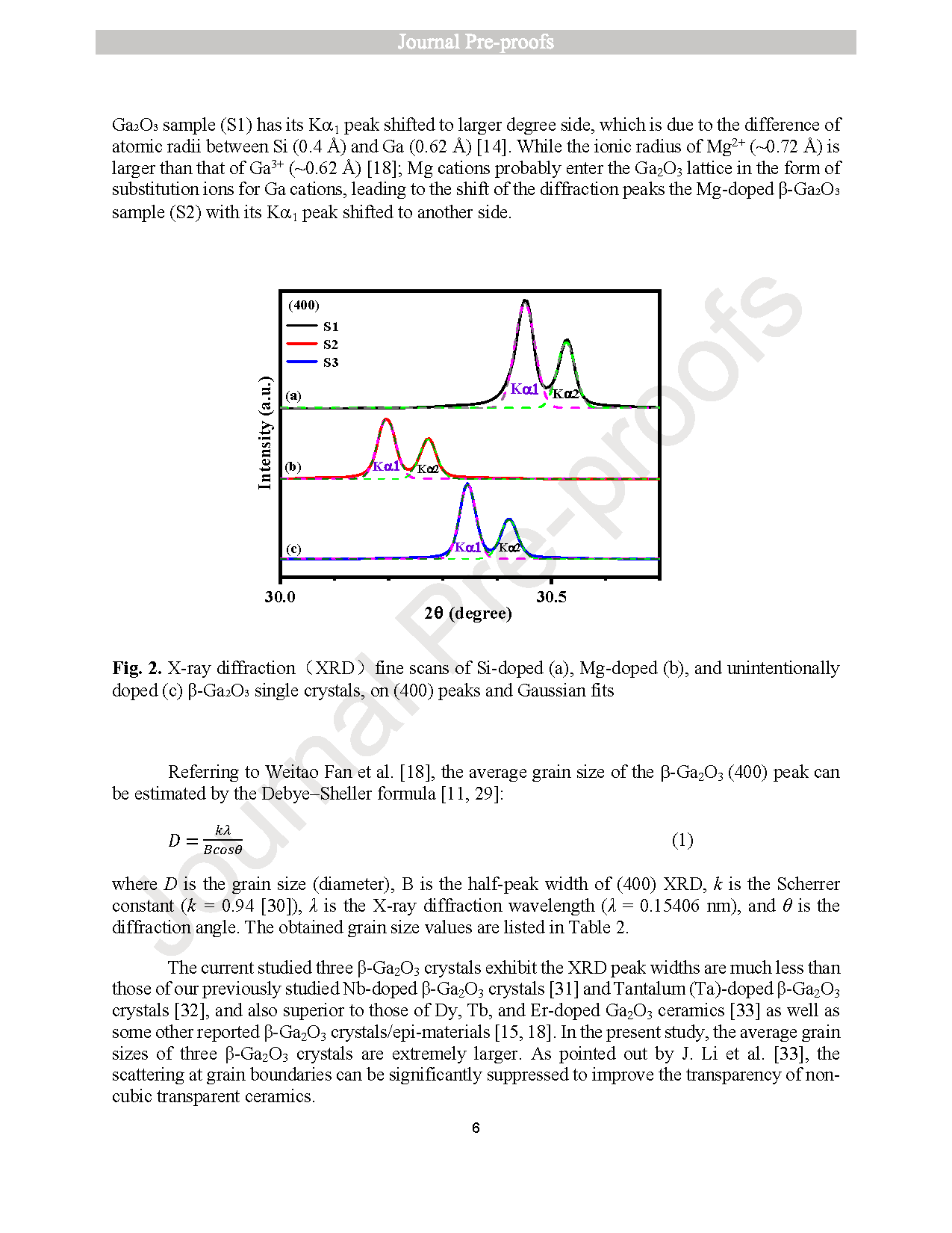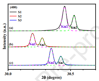 图2. Si 掺杂(a)、Mg 掺杂(b)及非故意掺杂(c)β-Ga2O3 单晶的 X 射线衍射(XRD)精细扫描图,显示 (400) 峰及高斯拟合曲线。