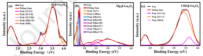 图3. 在 DUV(261 nm)激发下,室温光致发光(PL)光谱的高斯峰拟合结果:(a)Si 掺杂、(b)Mg 掺杂及(c)非故意掺杂的 β-Ga2O3 单晶。