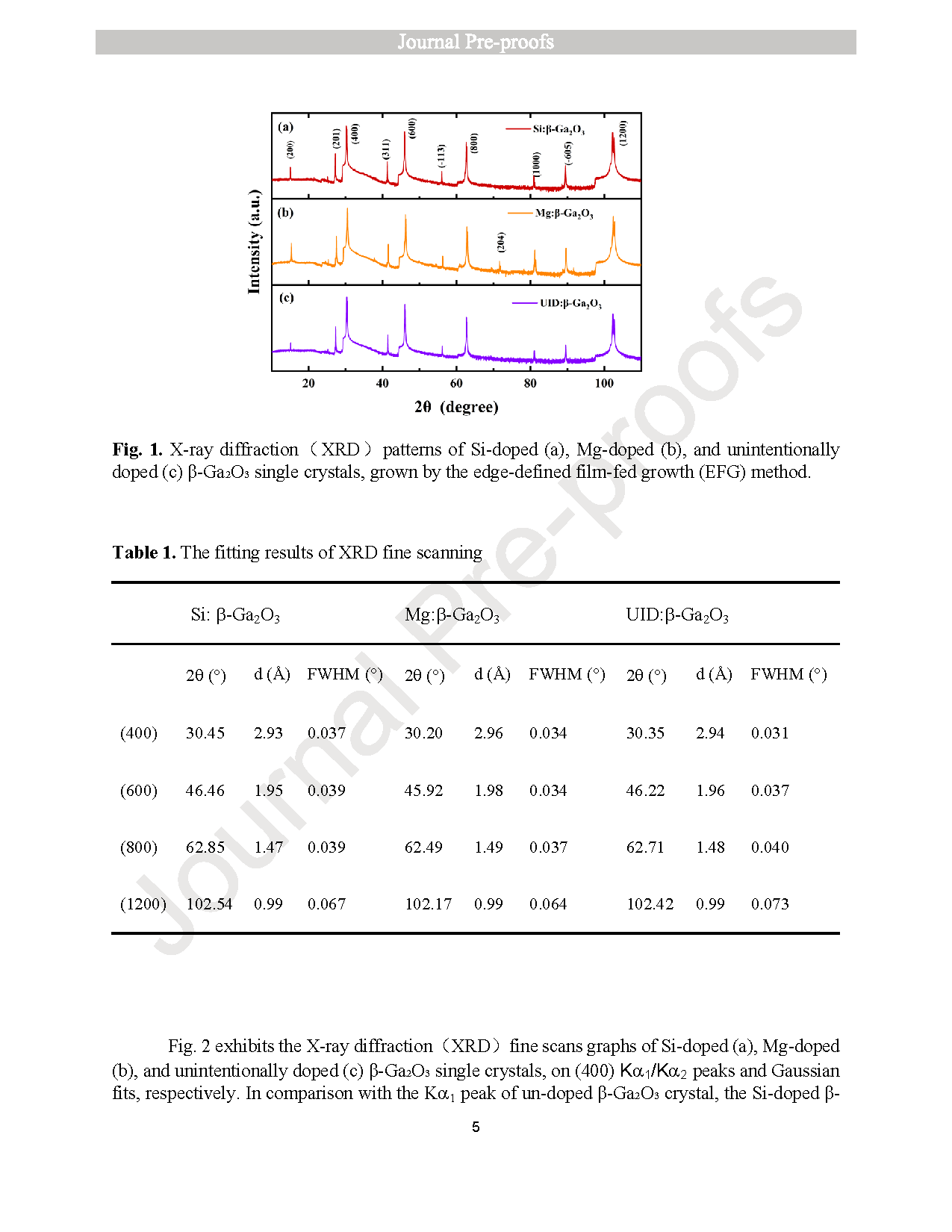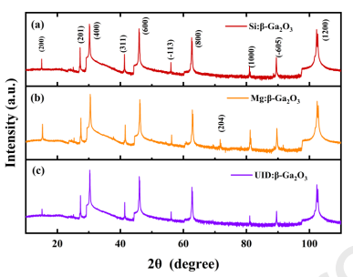 图1. 采用 EFG 生长的(a)Si 掺杂、(b)Mg 掺杂及(c)非故意掺杂 β-Ga2O3 单晶的 X 射线衍射(XRD)图谱。