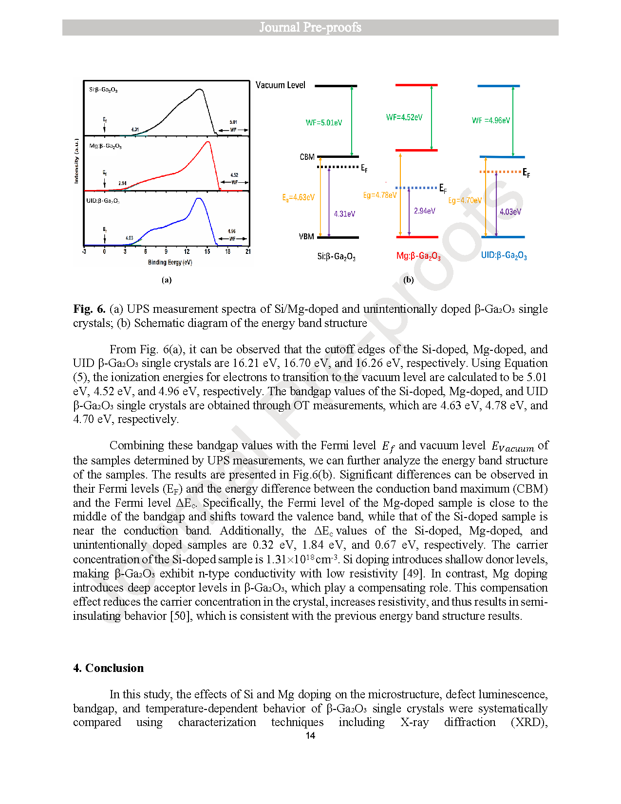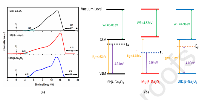 图6. (a) Si/Mg 掺杂与非故意掺杂 β-Ga2O3 单晶的 UPS 测量谱图;(b) 能带结构示意图。