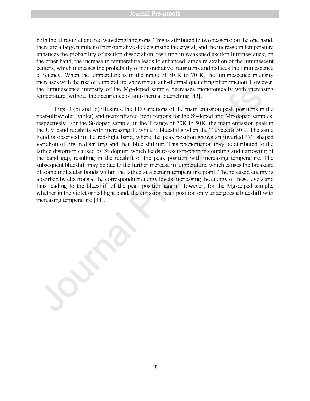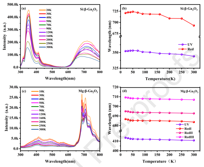 ● Si 掺杂 β-Ga2O3 的发光峰随温度呈现独特的红移-蓝移现象,与 Mg 掺杂材料的单调位移不同。