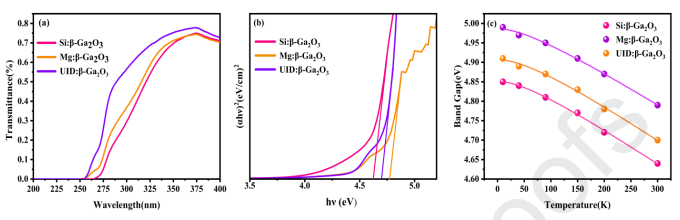 图5. (a) 室温下 Si/Mg 掺杂与非故意掺杂 β-Ga2O3 单晶的透射光谱,(b) 三种样品对应的 (ahn)2~hn 曲线,(c) 三种样品的带隙随温度变化曲线:彩色圆点代表实验数据点,实线表示拟合曲线。