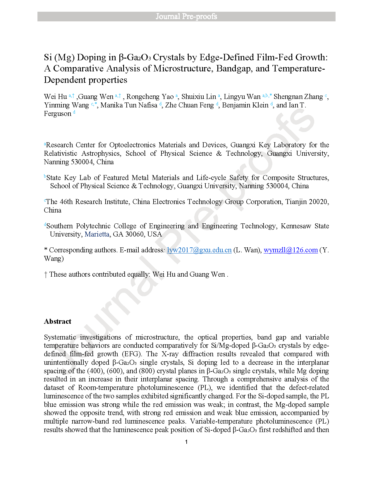 由中国电子科技集团公司第四十六研究所、广西大学、美国肯尼绍州立大学的研究团队在学术期刊 Journal of Crystal Growth 发布了一篇名为Si (Mg) doping in β-Ga2O3 crystals by edge-defined film-fed growth: A comparative analysis of microstructure, bandgap, and temperature-dependent properties(通过导模法在β-Ga2O3晶体中掺入Si(Mg):微观结构、带隙及温度依赖性特性的比较分析)的文章。
