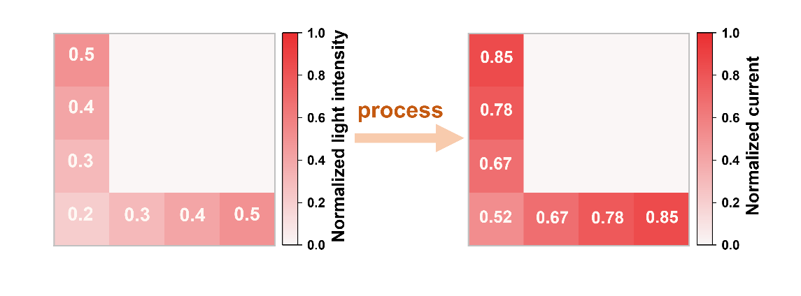 在Fashion-MNIST数据集测试中,对于严重曝光不足的图像,经由器件进行硬件预处理后,暗部细节显著恢复,识别准确率从65.20%跃升至83.44%。该成果证明了物理硬件可以高效分担算法任务,为未来低功耗仿生机器视觉系统提供了新思路。