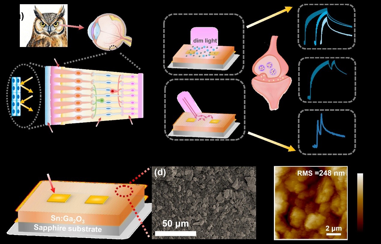 针对传统的人工视觉系统在灵敏度与算力消耗上的矛盾,南京邮电大学团队采用了晶界缺陷工程策略,制备了具有丰富晶界网络的粗糙Sn:Ga2O3多晶薄膜。该结构在物理层面模拟了猫头鹰的夜视功能,粗糙的晶粒表面通过漫反射延长光程,模拟了猫头鹰眼球后方照膜层的光陷阱效应,而高密度的晶界势垒则通过载流子俘获机制,模拟了视杆细胞对微弱信号的级联放大功能。