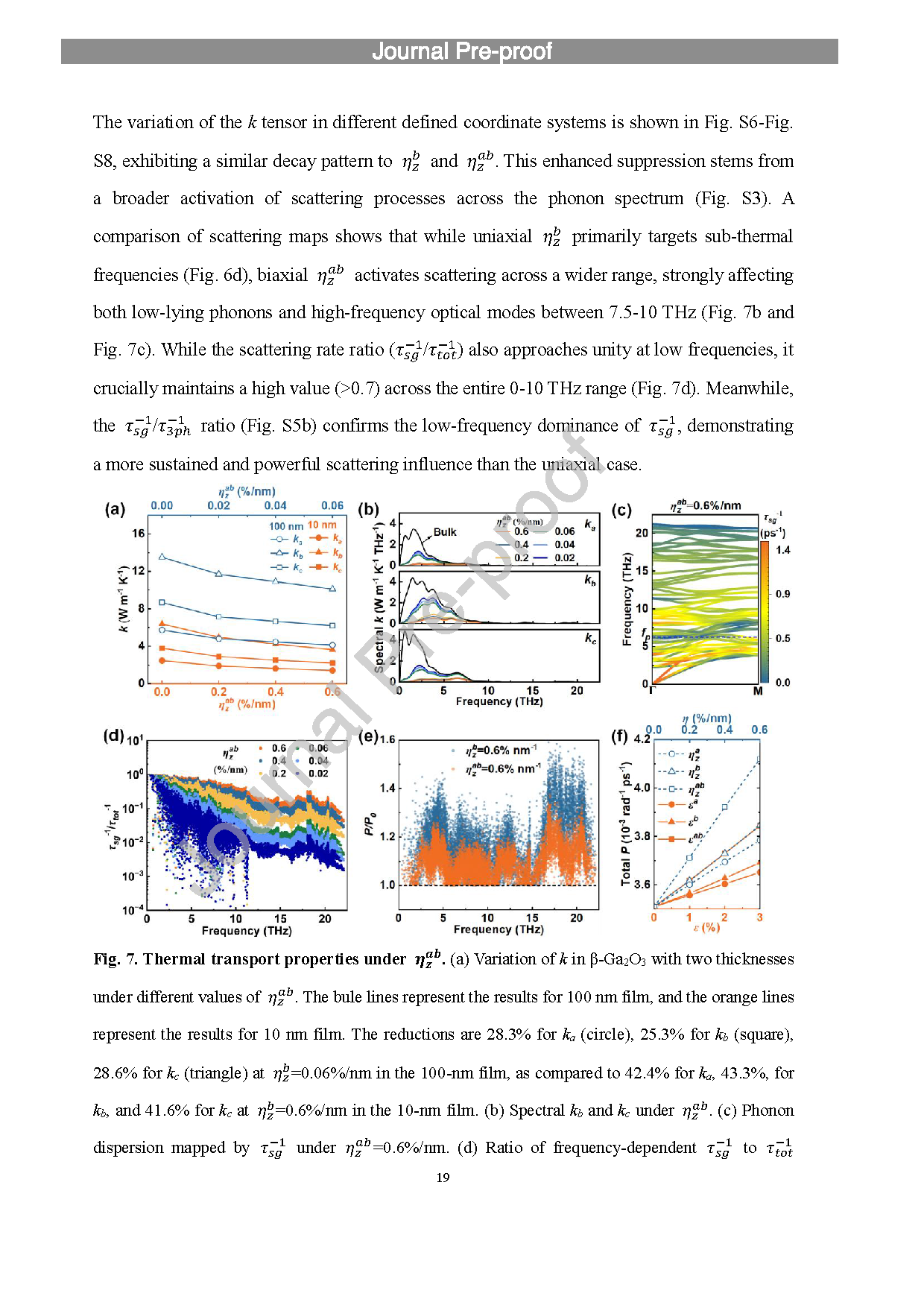值得注意的是,与ε不同,εb在–3%到3%范围内会使热各向异性比(thermal anisotropy ratio)变化约25%,而η在显著降低k的同时几乎不改变热各向异性,实现了二者的解耦。这一特性保证了工艺引入的应变可以可预测地降低热流,而不会改变设计的热路径——对于器件优化具有重要优势。其机理来源于两种协同效应:梯度引起的对称性破缺和模式间耦合增强。这两者共同激活了原本禁止的声子散射通道,显著扩展了散射相空间。这些效应优先抑制传热主力声子及低能光学声子,在适度 η 下,梯度诱导散射成为0–10 THz热频谱范围内的主导散射机制。此一致,将相同方法应用于正交κ-Ga₂O₃,虽然整体k下降相当,但在相同η下热各向异性受到显著抑制。这一对比表明,梯度激活的声子散射及随之的k抑制在材料间可广泛迁移,但热导率幅值抑制与各向异性演化的解耦效应具有材料特异性,低对称性β-Ga₂O₃对这一效应尤为敏感。