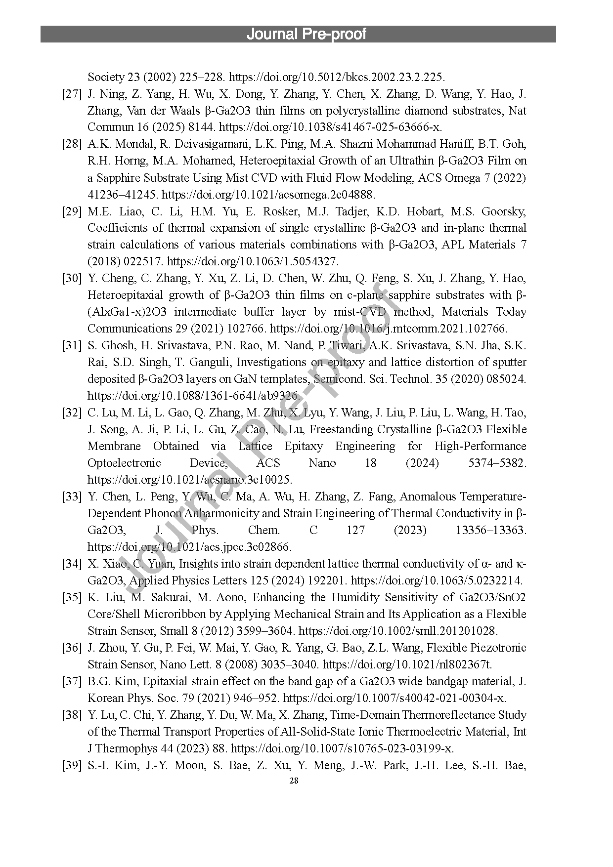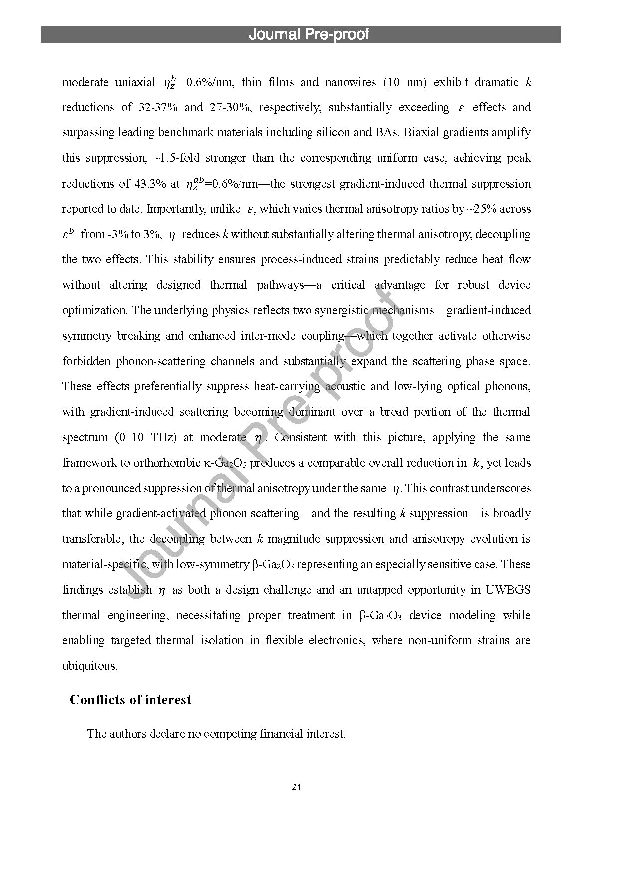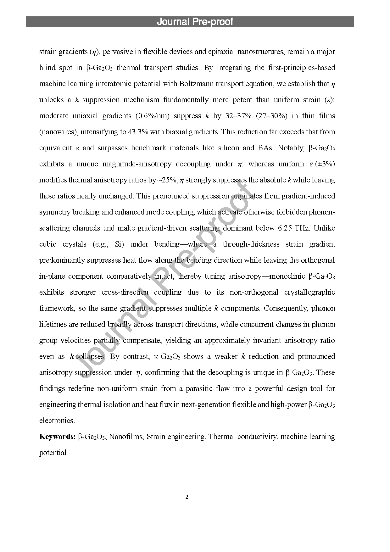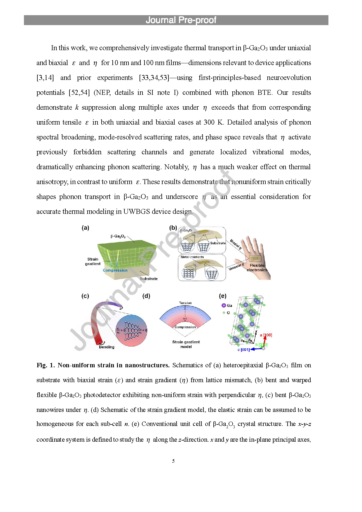 这些发现表明,η既是设计中的挑战,也是超宽禁带半导体(UWBGS)热管理中的潜在机会。在β-Ga₂O₃器件建模中必须考虑非均匀应变,同时在柔性电子器件中,可利用其普遍存在的非均匀应变实现针对性的热隔离设计。