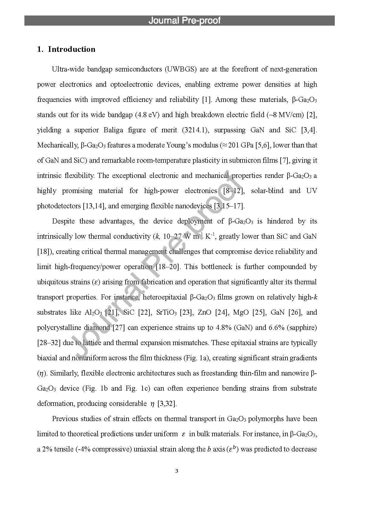 β-Ga₂O₃ 是一种新兴的超宽禁带半导体(UWBGS),在高效高频功率电子器件、日盲/紫外光电探测器以及可穿戴与柔性器件等领域具有广阔应用前景,并具备可规模化制造潜力。然而,其本征热导率(k)较低,加之在器件制备与工作过程中不可避免引入的非均匀应变,使得热管理面临严峻瓶颈,进而削弱散热能力、器件可靠性与整体性能。因此,深入理解均匀与非均匀应变对该超宽禁带材料热输运行为的影响,对热管理设计至关重要。尽管如此,在柔性器件与外延纳米结构中普遍存在的应变梯度(η),在 β-Ga₂O₃ 热输运研究中仍是一个显著的认知盲区。