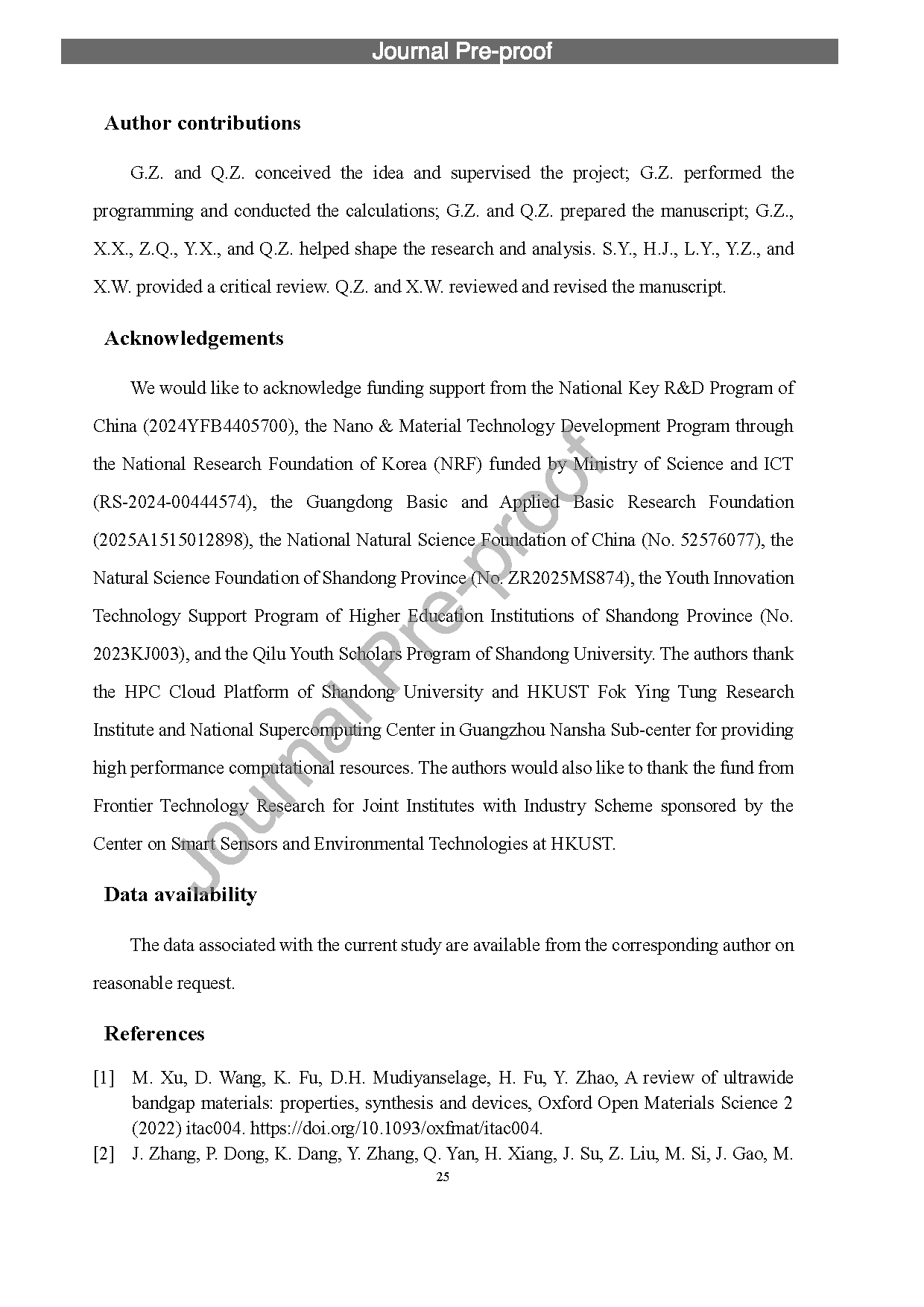本工作得到了国家重点研发计划(2024YFB4405700)、韩国国家研究基金会(NRF)通过科学技术信息通信部资助的纳米与材料技术发展计划(RS-2024-00444574)、广东省基础与应用基础研究基金(2025A1515012898)、国家自然科学基金(52576077)、山东省自然科学基金(ZR2025MS874)、山东省高等学校青年创新科技支持计划(2023KJ003)以及山东大学齐鲁青年学者计划的资助。作者感谢山东大学高性能计算云平台、香港科技大学霍英东研究院以及广州南沙国家超级计算中心分中心提供的高性能计算资源。此外,作者还感谢香港科技大学智能传感与环境技术中心通过“产学联合研究前沿技术计划”提供的经费支持。