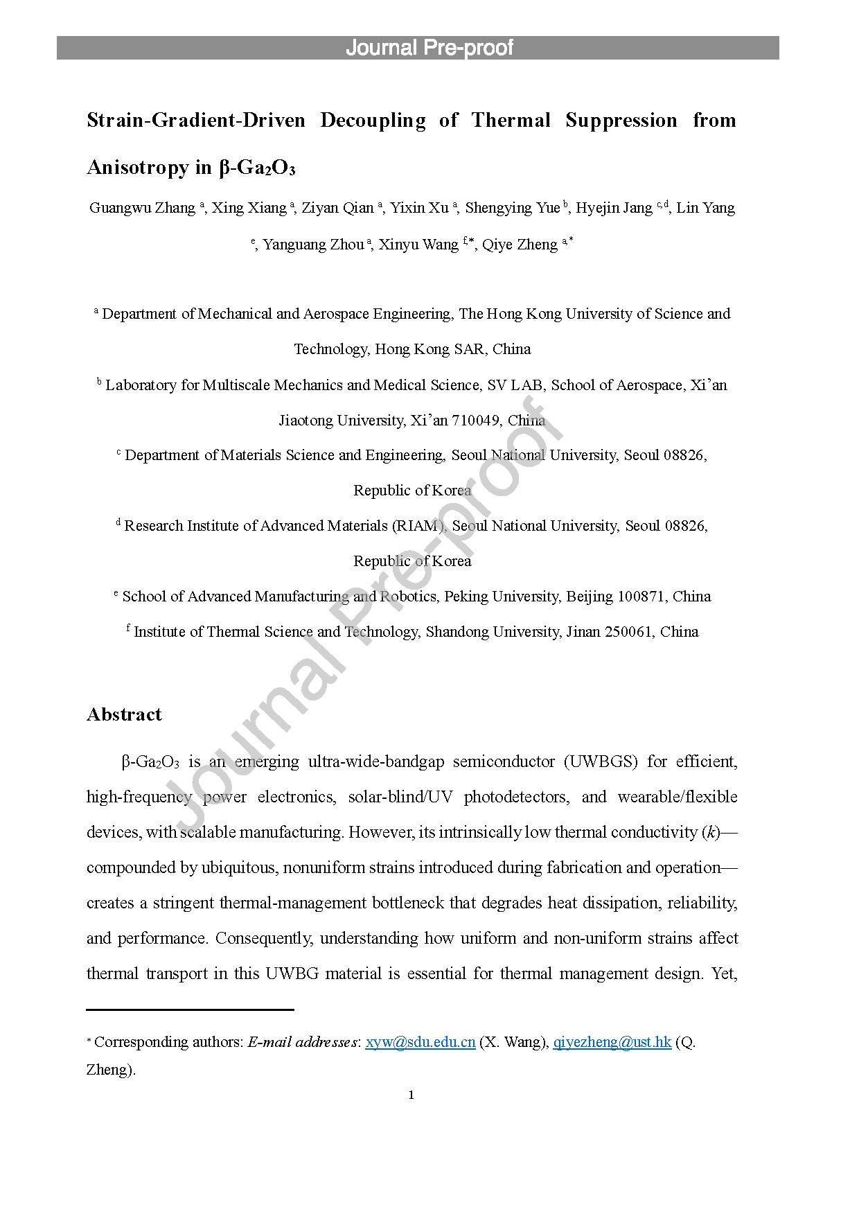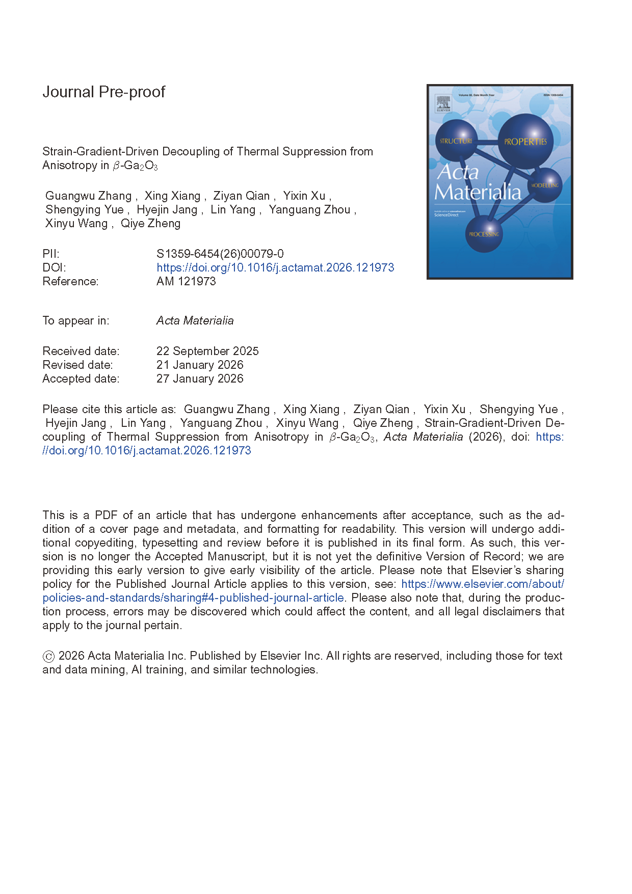 由香港科技大学的研究团队在学术期刊 Acta Materialia 发布了一篇名为 Strain-Gradient-Driven Decoupling of Thermal Suppression from Anisotropy in β-Ga₂O₃(应变梯度驱动下 β-Ga₂O₃ 热导率抑制与各向异性解耦)的文章。