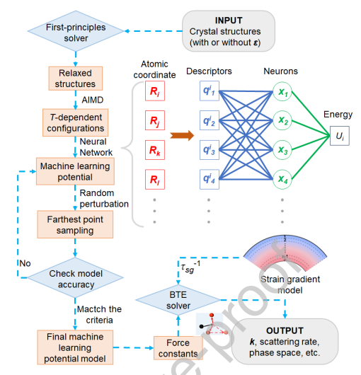 图 2. 完整计算框架。该计算过程广泛采样第一性原理数据,采用可分离自然进化策略(SNES)和前馈神经网络 [52] 构建势能模型,从而显著减少在不同应变下计算力常数的计算工作量。结合应变梯度模型,可以获得应变梯度对应热传导的影响。