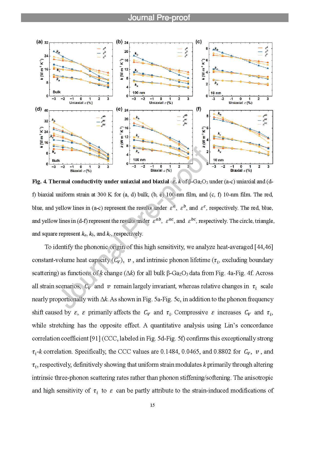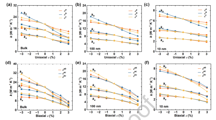 图 4. β-Ga2O3 在单轴和双轴均匀应变下的热导率。β-Ga2O3 在 300 K 下的热导率 (k) 分别在以下条件下计算: (a, d) 块体材料,(b, e) 100 nm 薄膜,(c, f) 10 nm 薄膜。(a–c) 中的红色、蓝色和黄色曲线分别表示在 εa、εb 和 εc 单轴应变下的结果。(d–f) 中的红色、蓝色和黄色曲线分别表示在 εab、εac 和 εbc 双轴应变下的结果。圆形、三角形和方形分别代表 ka、kb 和 kc。