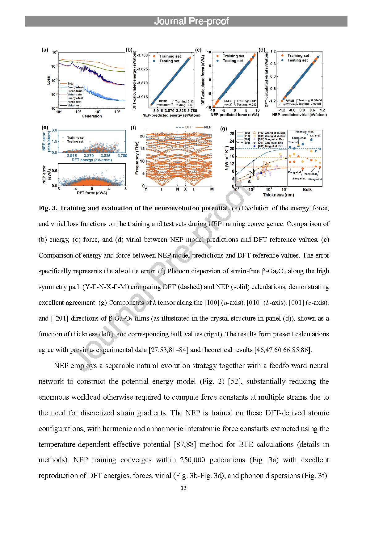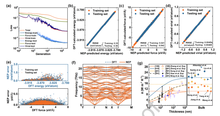 图 3. 神经进化势(NEP)的训练与评估。(a) NEP 训练收敛过程中,训练集和测试集上的能量、力及应力(virial)损失函数变化。 (b–d) NEP 模型预测值与 DFT 参考值的对比,包括能量 (b)、力 (c) 以及应力 (d)。 (e) NEP 模型预测值与 DFT 参考值的能量和力对比,其中误差表示绝对误差。 (f) 无应变 β-Ga2O3 沿高对称路径 (Y–Γ–N–X–Γ–M) 的声子色散,DFT 计算用虚线表示,NEP 计算用实线表示,结果显示两者高度一致。 (g) β-Ga2O3 薄膜沿 [100](a 轴)、[010](b 轴)、[001](c 轴)及 [-201] 方向的热导张量 (k) 分量(如面板 (d) 晶体结构所示),随厚度变化展示(左图),以及对应的体材料值(右图)。