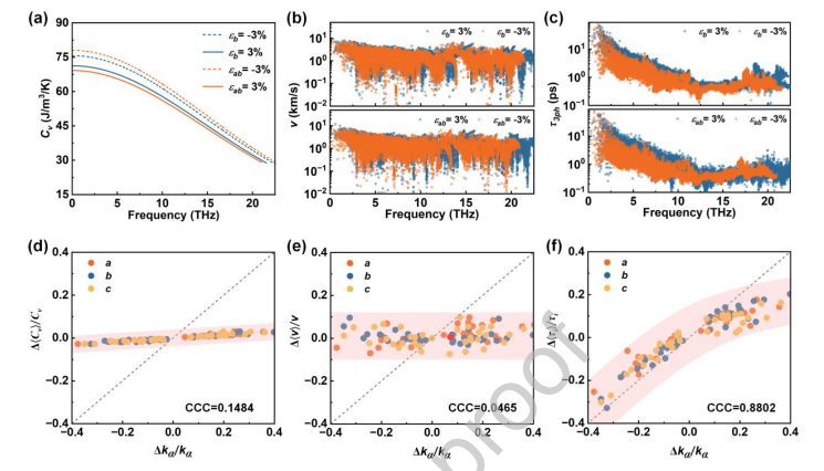 图 5. CV、v、τi 与热导率 k 的相对变化关系(a) 光谱 CV、(b) v 和 (c) τi 在块体 β-Ga2O3 中单轴和双轴应变 ε 下的变化。(d–f) 所有晶向下热平均的 CV、v 和 τi 与热导率相对变化 Δk 的相关性,在块体 β-Ga2O3 中单轴和双轴应变 ε 下。