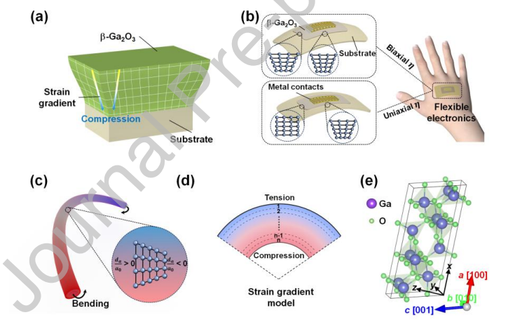 图 1. 纳米结构中的非均匀应变。示意图:(a) 由于晶格失配引起双轴应变(ε)和应变梯度(η)的异质外延β-Ga₂O₃薄膜;(b) 弯曲且翘曲的柔性β-Ga₂O₃光电探测器,显示垂直方向的非均匀应变η;(c) 受η作用的弯曲β-Ga₂O₃纳米线;(d) 应变梯度模型示意图,其中每个子单元 n 的弹性应变可假定为均匀;(e) β-Ga₂O₃晶体结构的常规晶胞。定义了 x–y–z 坐标系以研究沿 z 方向的应变梯度η,其中 x 和 y 为面内主轴,z 为应变梯度方向。