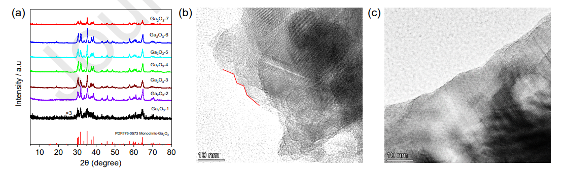 图 1.(a) 通过不同方法制备的Ga2O3催化剂的XRD图谱;(b) 晶粒最小的Ga2O3-1的高分辨透射电子显微镜(HRTEM)图像;(c) 晶粒最大的Ga2O3-7的HRTEM图像。